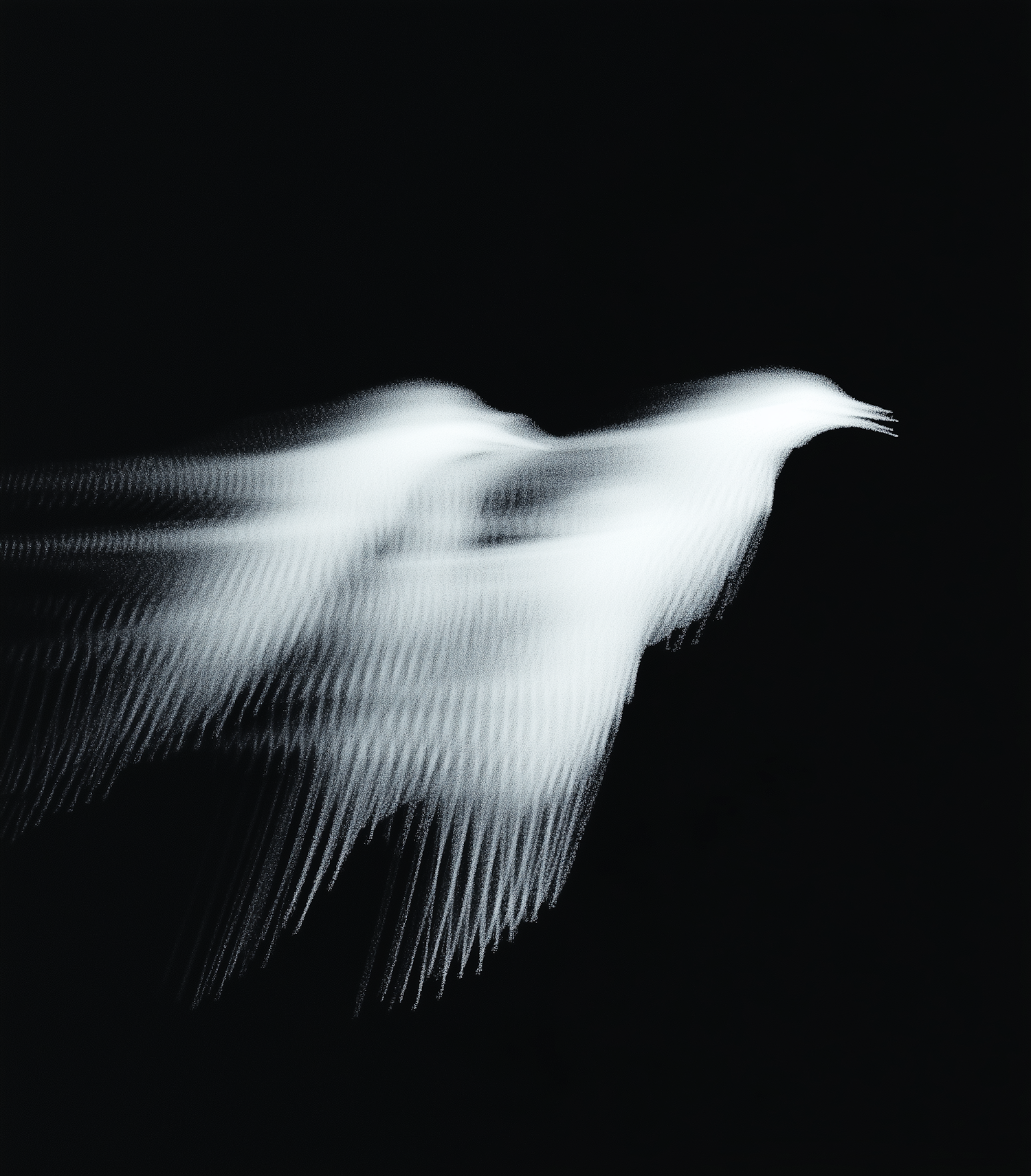 Abstract image of a bird in motion with ghostly blur against a black background, creating a sense of speed and ethereal beauty.