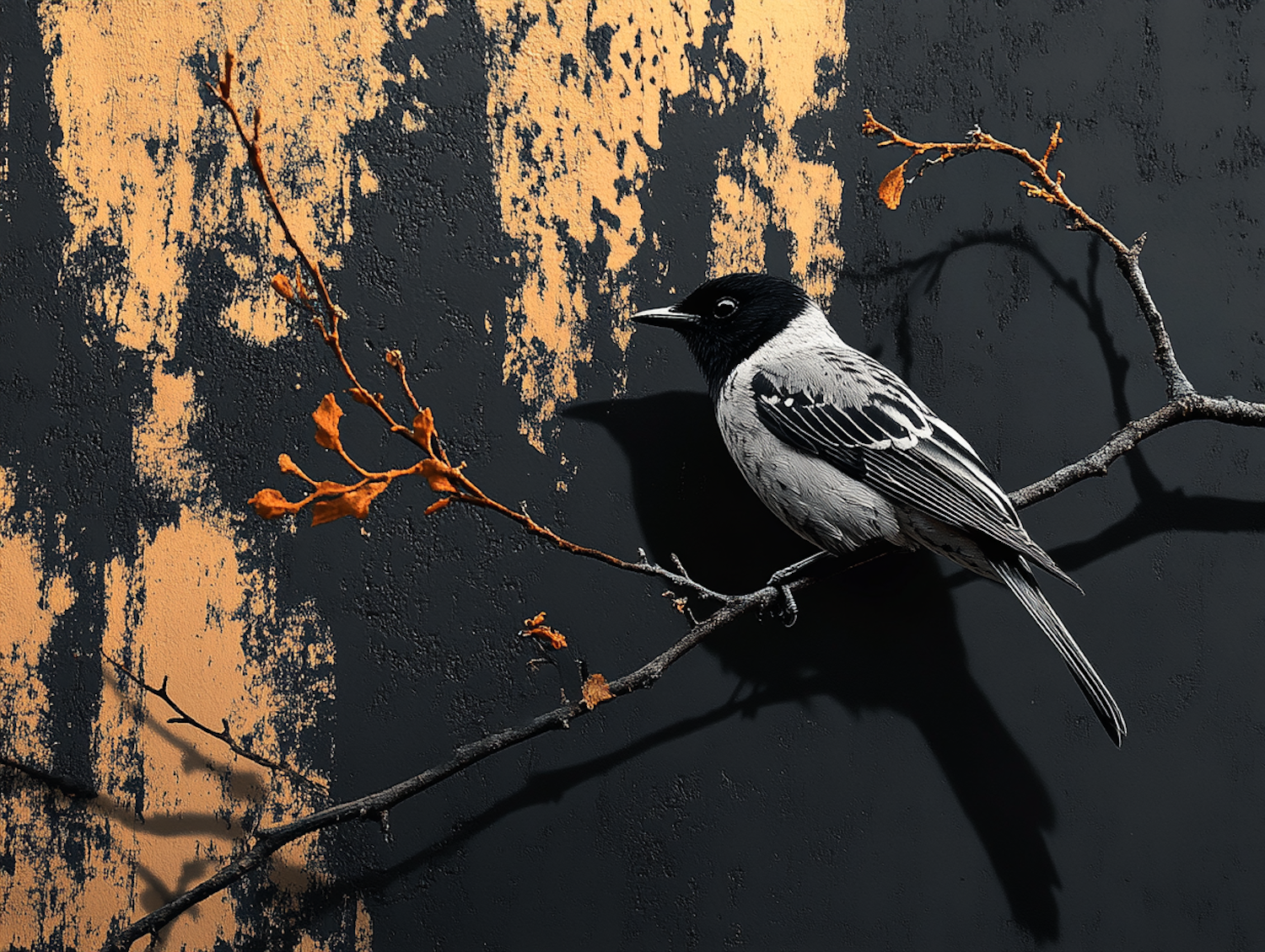 Elegant black and white bird on a branch with orange leaves against a textured black and gold background.
