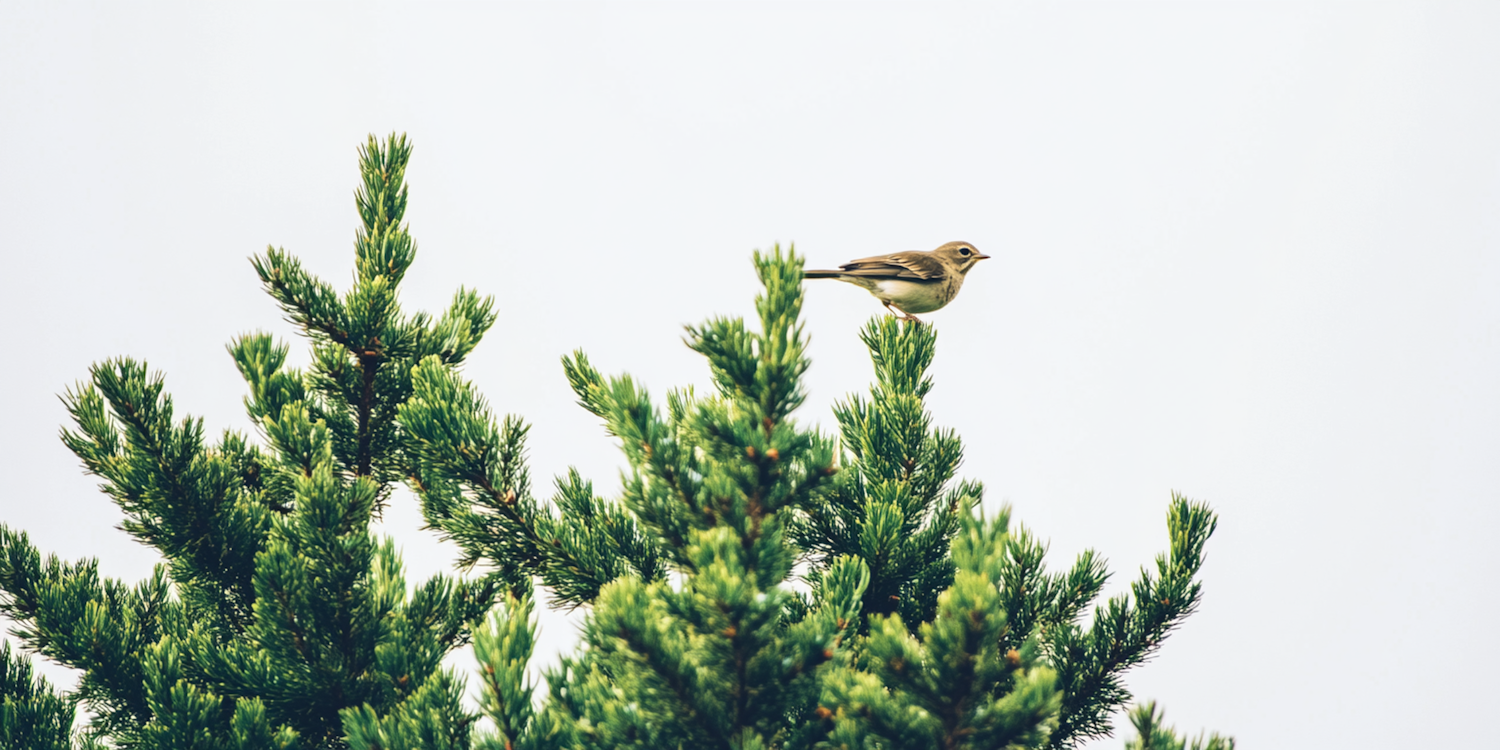 A small bird perched on a lush green pine tree against a clear sky, creating a serene and natural scene.