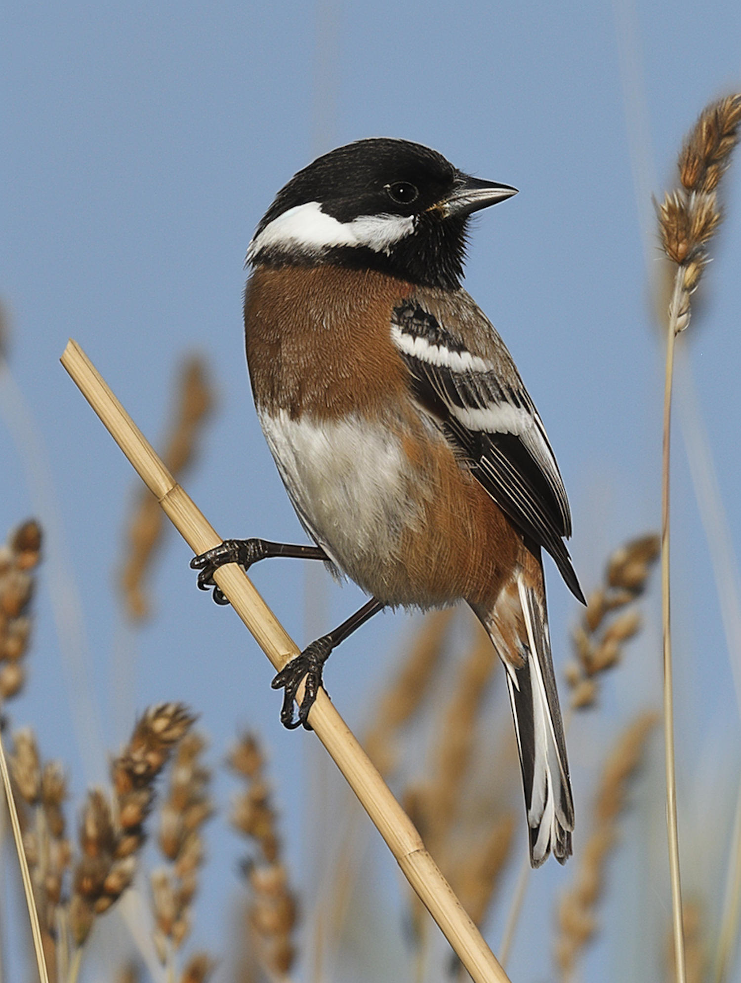 A striking bird with black, white, and brown plumage perched on a reed against a clear blue sky.