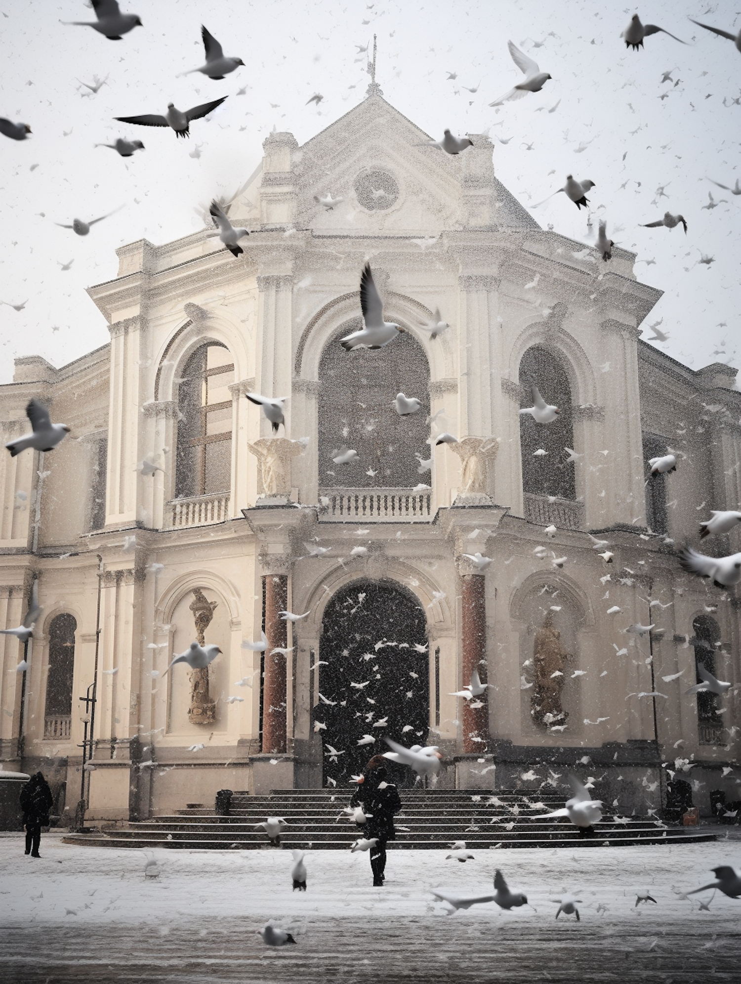 Historic building in snow with birds in flight, creating a dynamic winter scene. Ornate architecture and serene atmosphere.