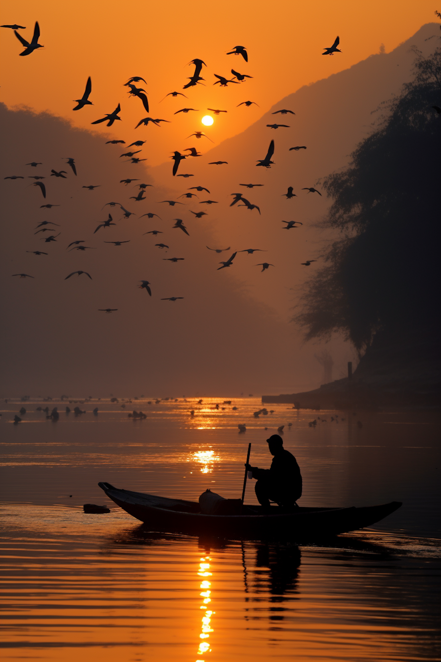 Silhouetted person paddling a boat on a golden river at sunrise, with birds in flight and a serene, glowing orange sky.