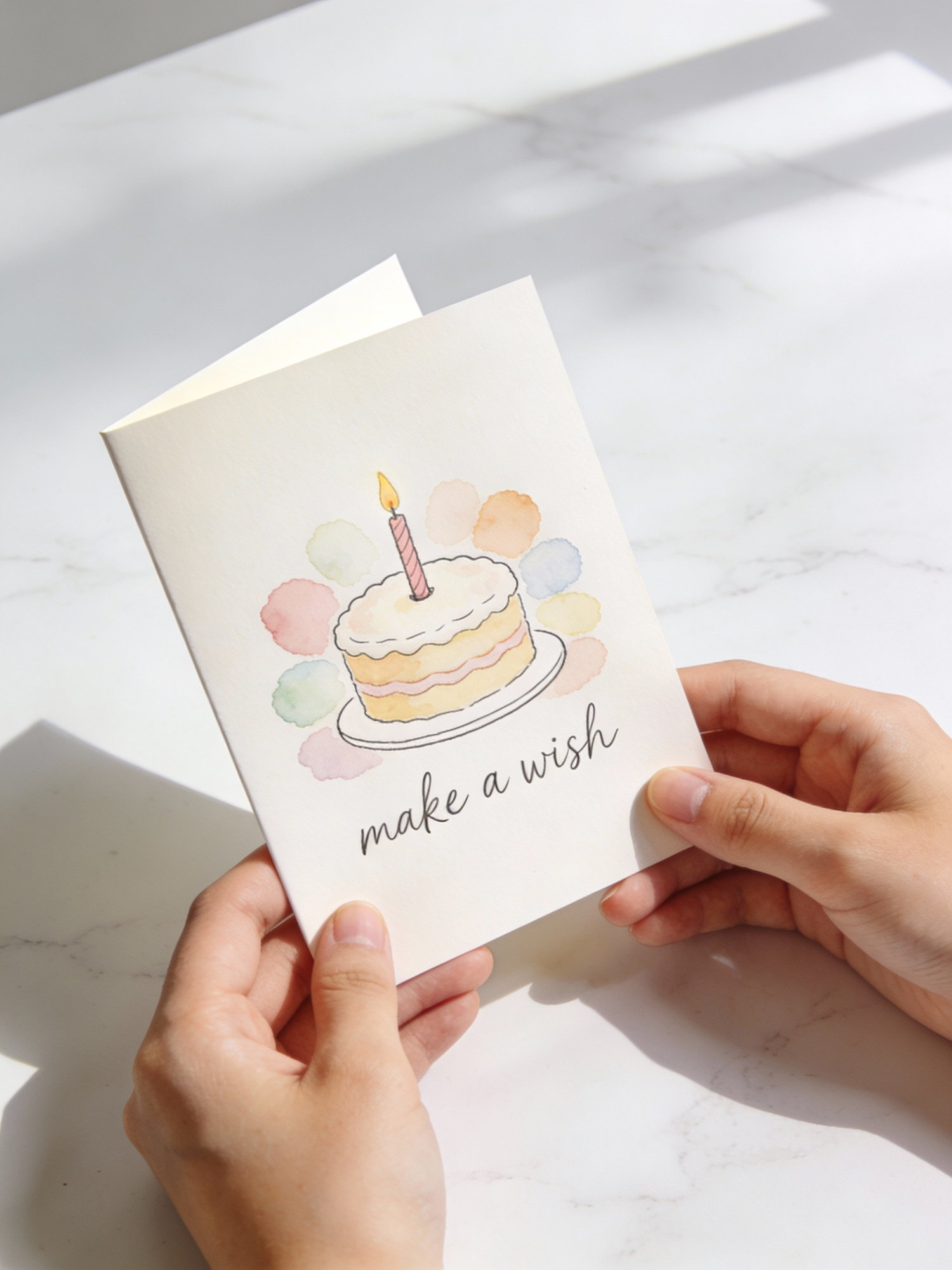 A greeting card with a watercolor birthday cake and 'make a wish' text, held by hands on a light marble surface.