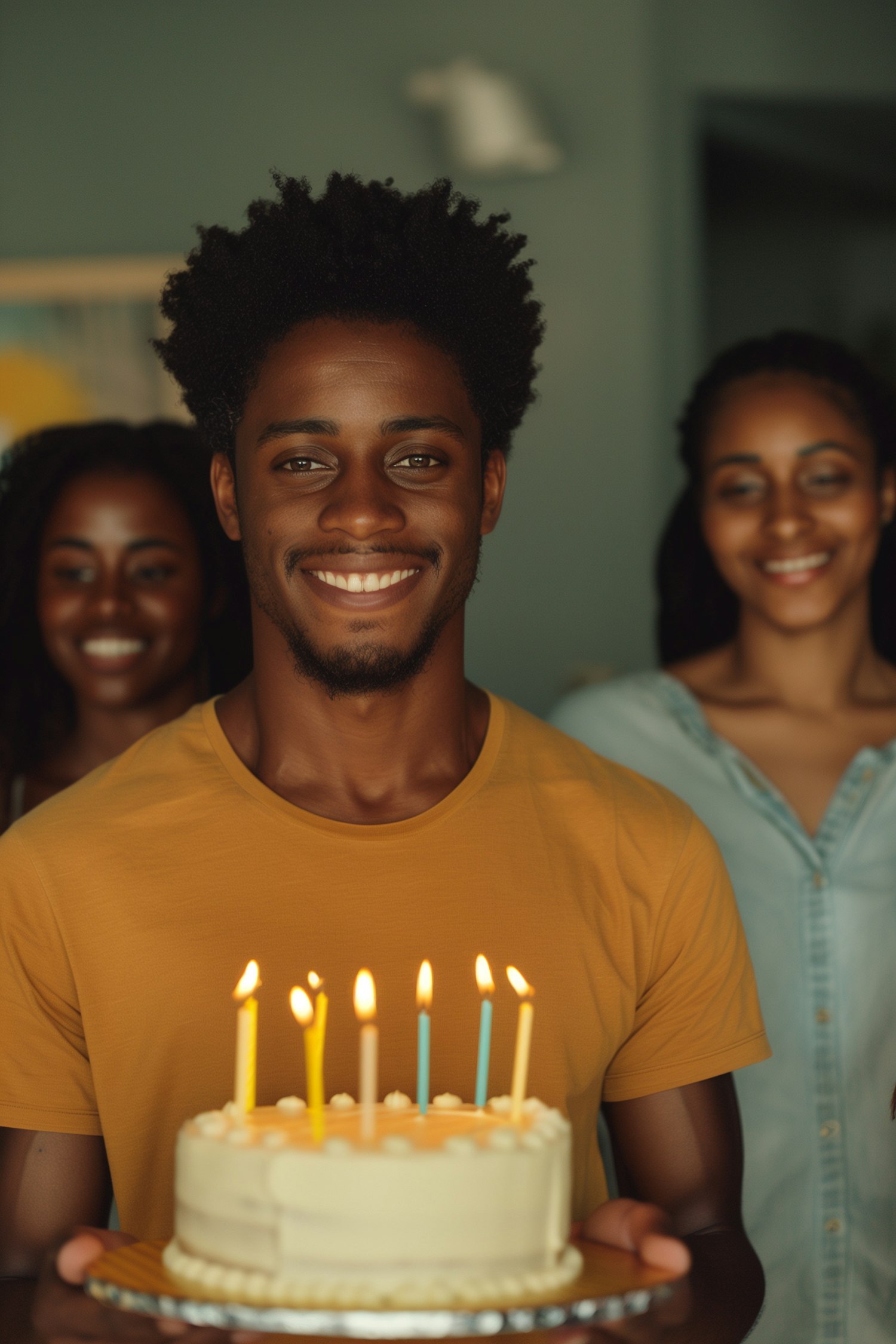 Smiling young man holding a birthday cake with lit candles, surrounded by friends. Warm, joyful celebration atmosphere.