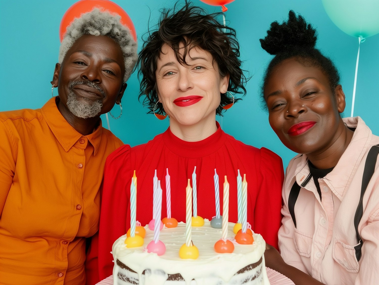 Three friends celebrate a birthday with a cake and colorful candles, set against a vibrant turquoise background with balloons.