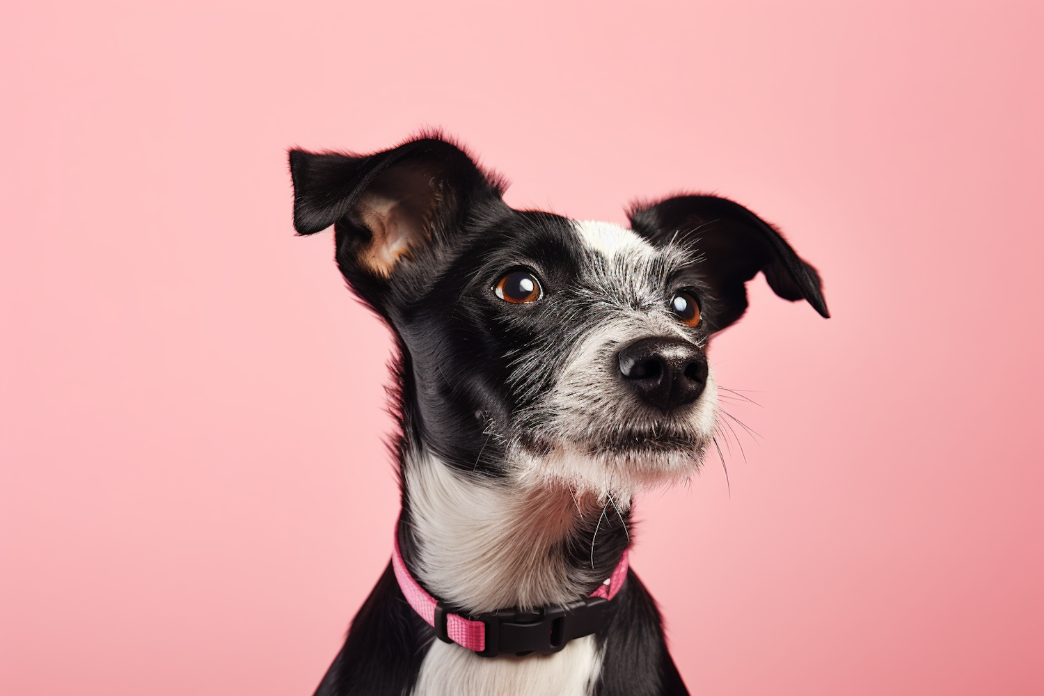 Adorable black and white dog with a pink collar against a pink background, showcasing its curious expression and perky ears.