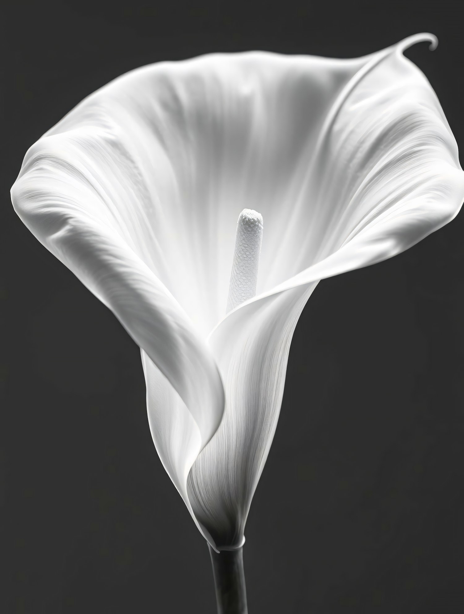 A stunning black-and-white close-up of a calla lily, showcasing its elegant curves and textures against a dark background.
