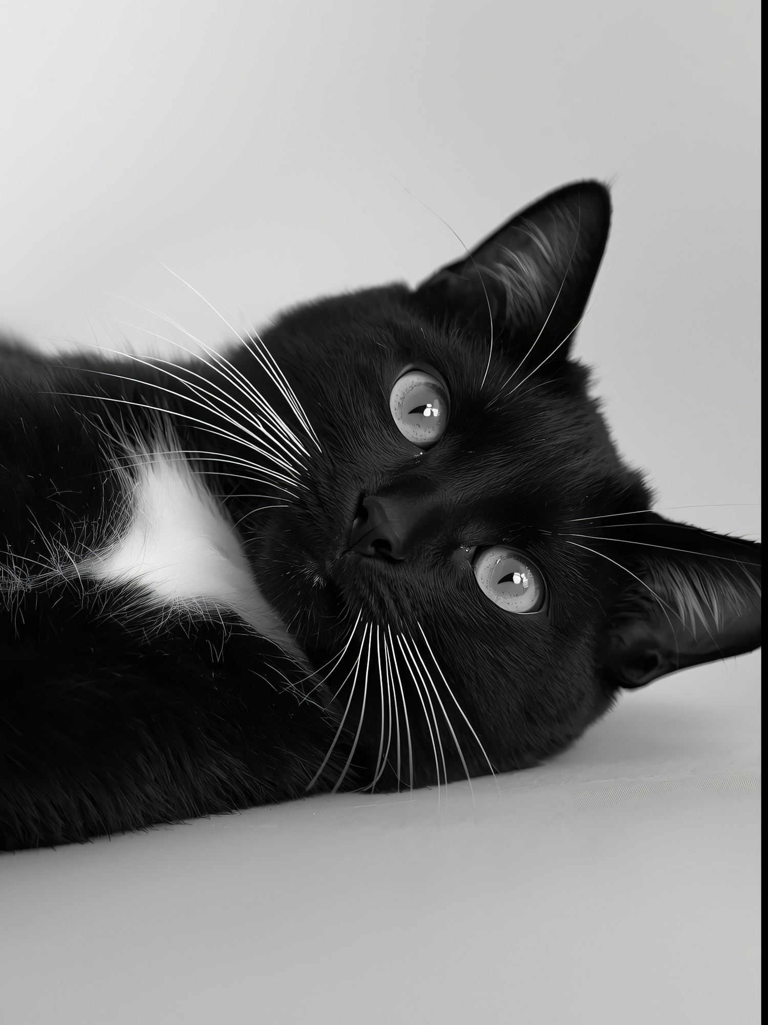 Close-up of a black and white cat with bright eyes and sleek fur, lying on its side against a neutral background.