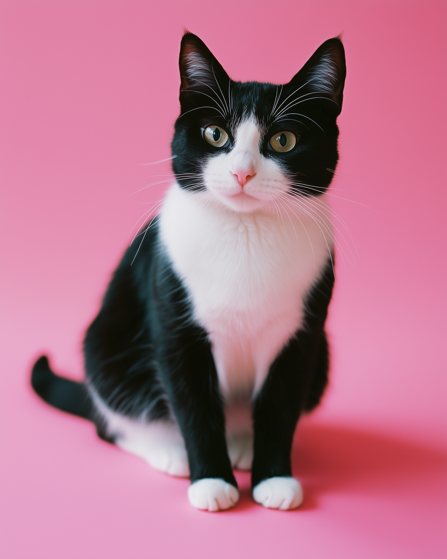 Elegant black and white tuxedo cat with green eyes sits against a vibrant pink background, showcasing its sleek fur and curious expression.