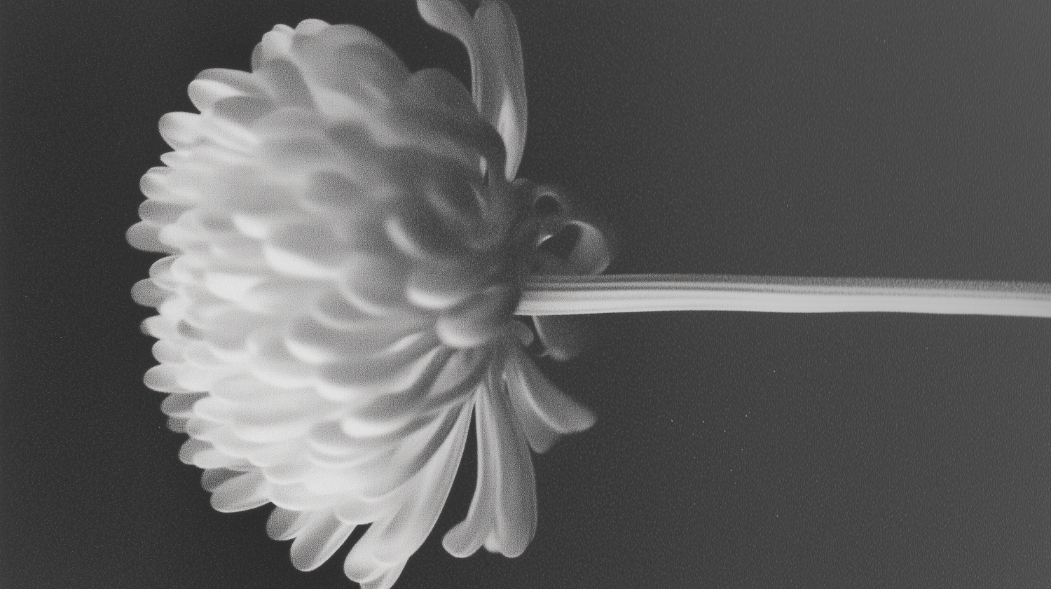 Black-and-white close-up of a chrysanthemum flower with detailed petals against a dark background, creating a minimalist aesthetic.