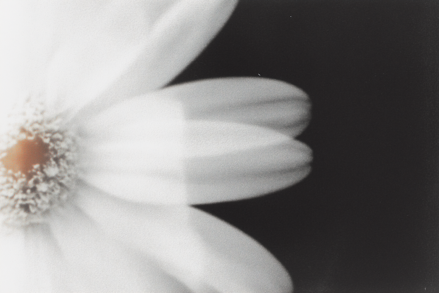 Black-and-white close-up of a daisy with soft petals and a textured center, set against a dark, blurred background.