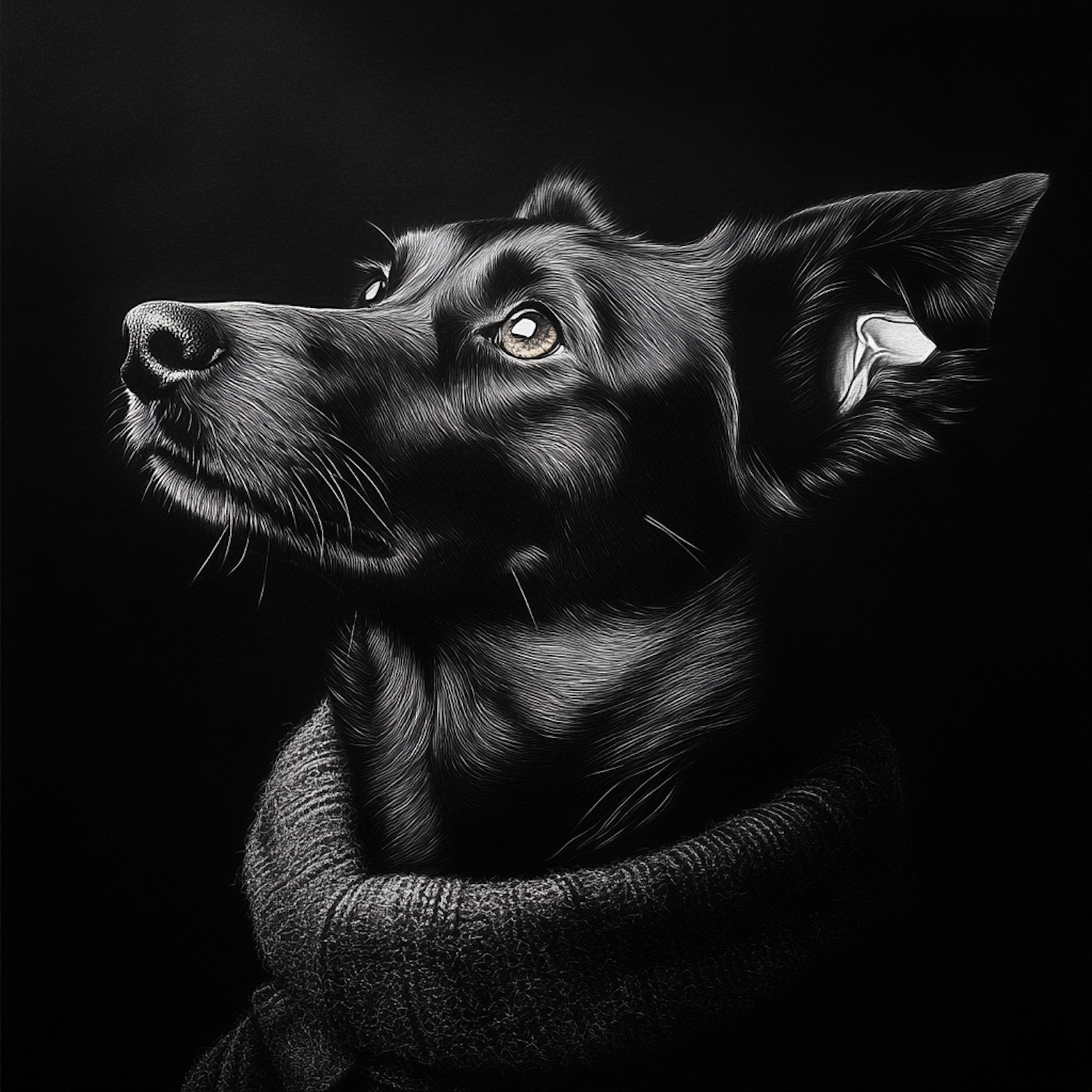Black and white illustration of a dog in a scarf, showcasing detailed fur texture and a serene expression against a dark background.