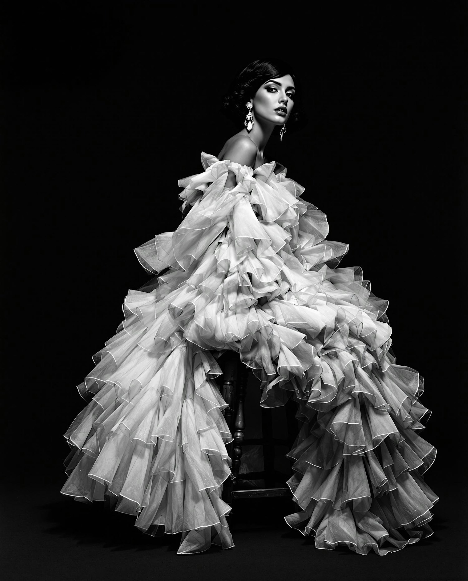 A model sits elegantly in a voluminous, flowing gown with textured layers, captured in a dramatic, high-contrast black-and-white setting.