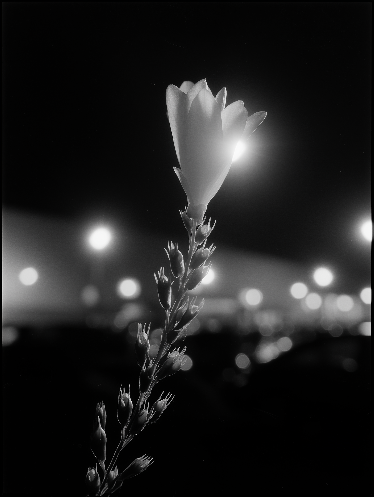 Black-and-white photo of a single flower with glowing bokeh lights in the background, creating a dreamy and elegant atmosphere.