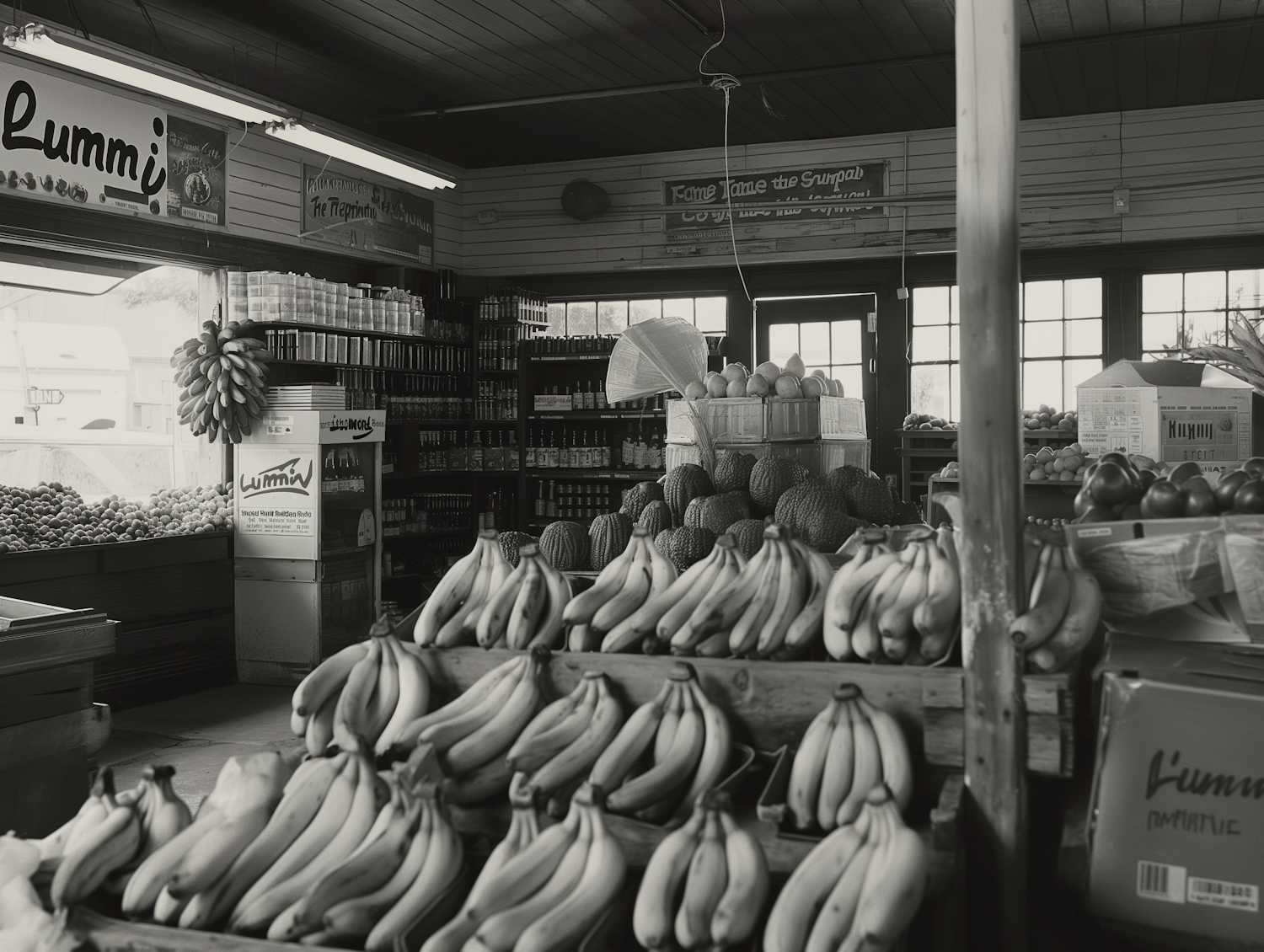 Black-and-white image of a rustic fruit market with bananas, melons, and produce neatly displayed under natural light.