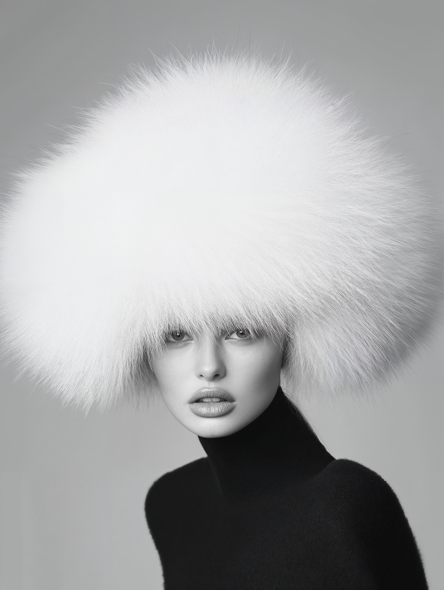 A high-fashion black-and-white portrait of a woman in a fluffy white fur hat and sleek black turtleneck, exuding elegance and contrast.