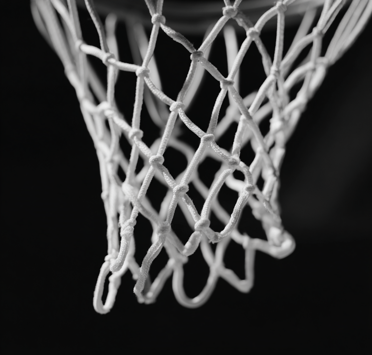 Close-up black & white shot of a basketball hoop's net showcasing its intricate weave against a blurred dark background.