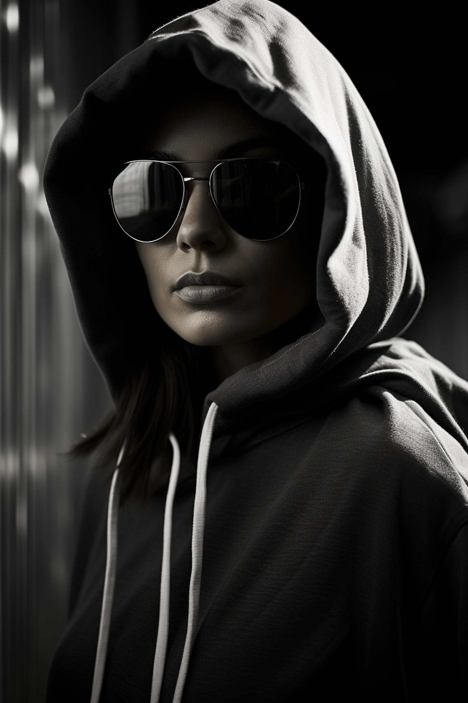 Mysterious figure in a hoodie and sunglasses, dramatic lighting, monochrome tones, enigmatic and moody atmosphere.