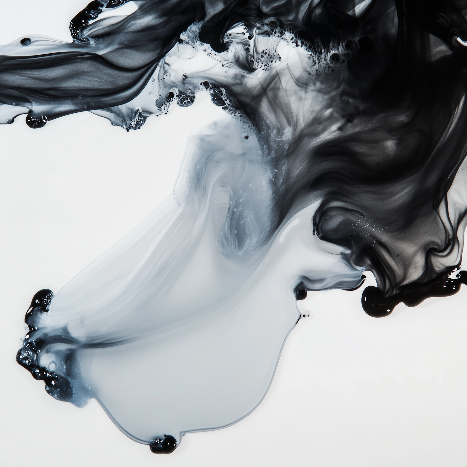 Abstract black and white ink swirls create a dynamic, fluid motion with intricate patterns and textures on a clean white background.