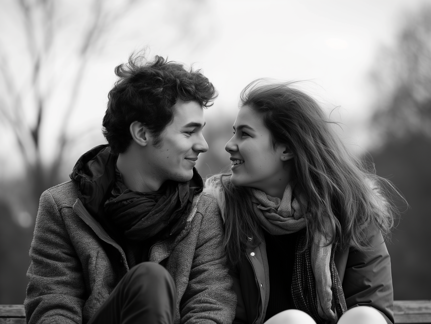 A young couple shares a warm moment on a bench, smiling at each other in a serene park setting.