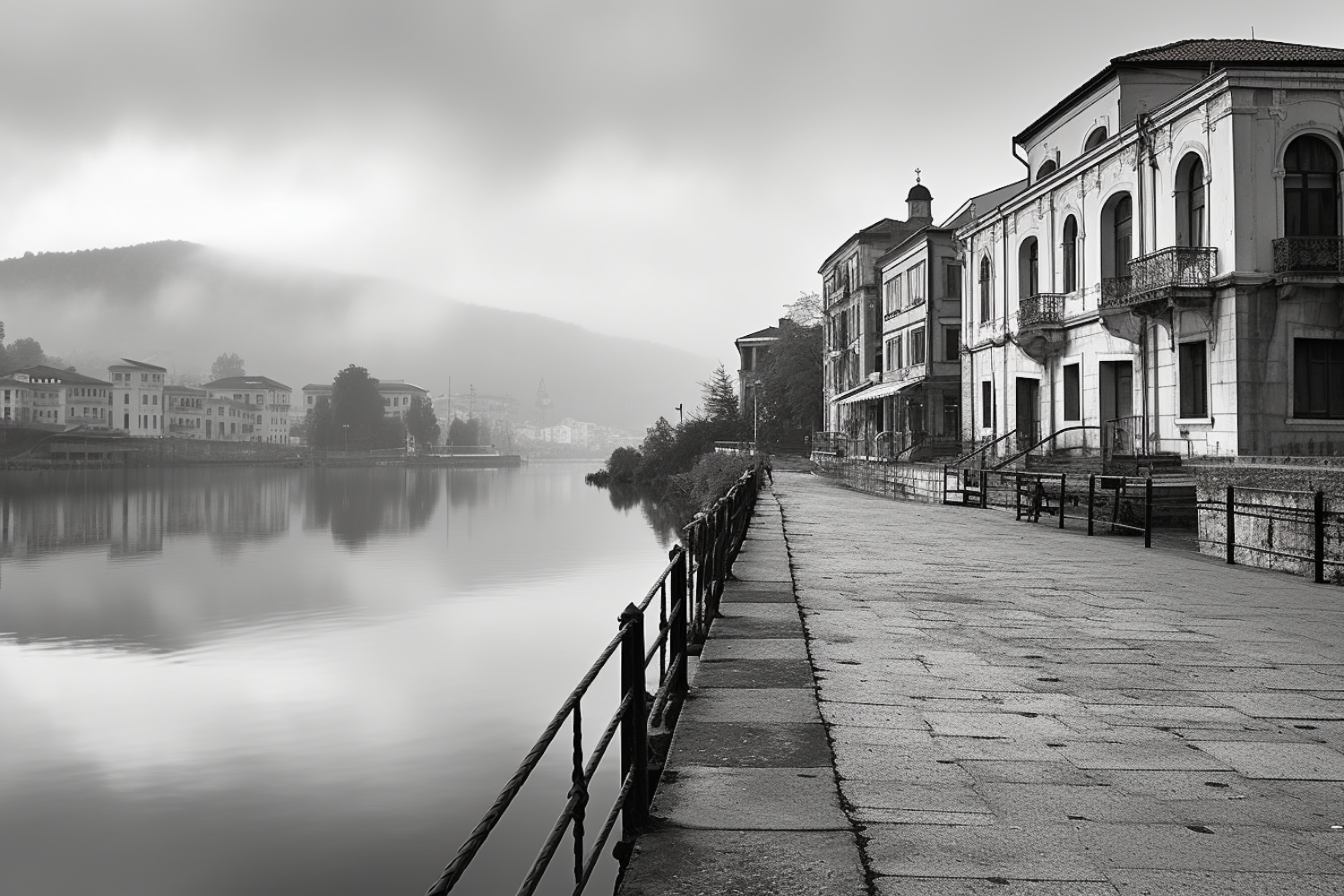 Misty riverside with historic buildings and cobblestone walkway, reflecting a serene and timeless atmosphere in monochrome.