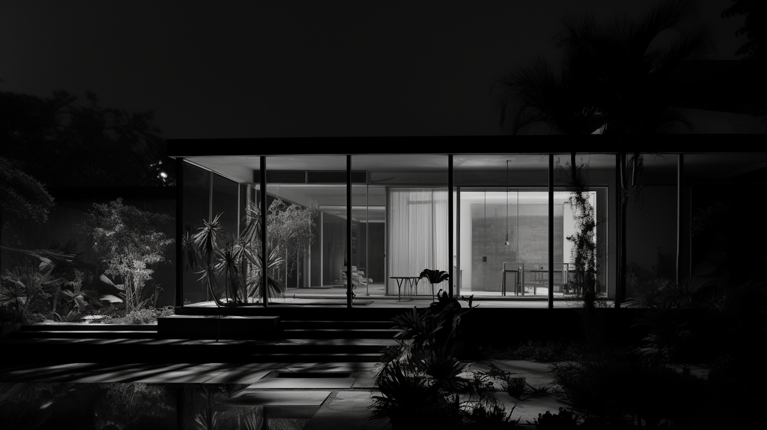 Modern minimalist house with large glass windows, illuminated interior, and lush garden in black and white contrast.