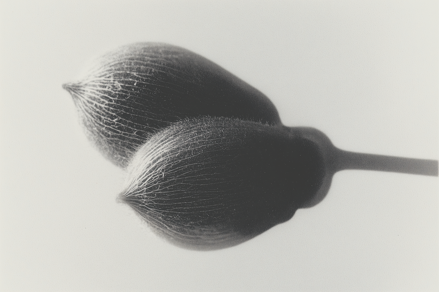 Minimalist black-and-white close-up of two textured plant buds on a stem, showcasing intricate details and soft lighting.