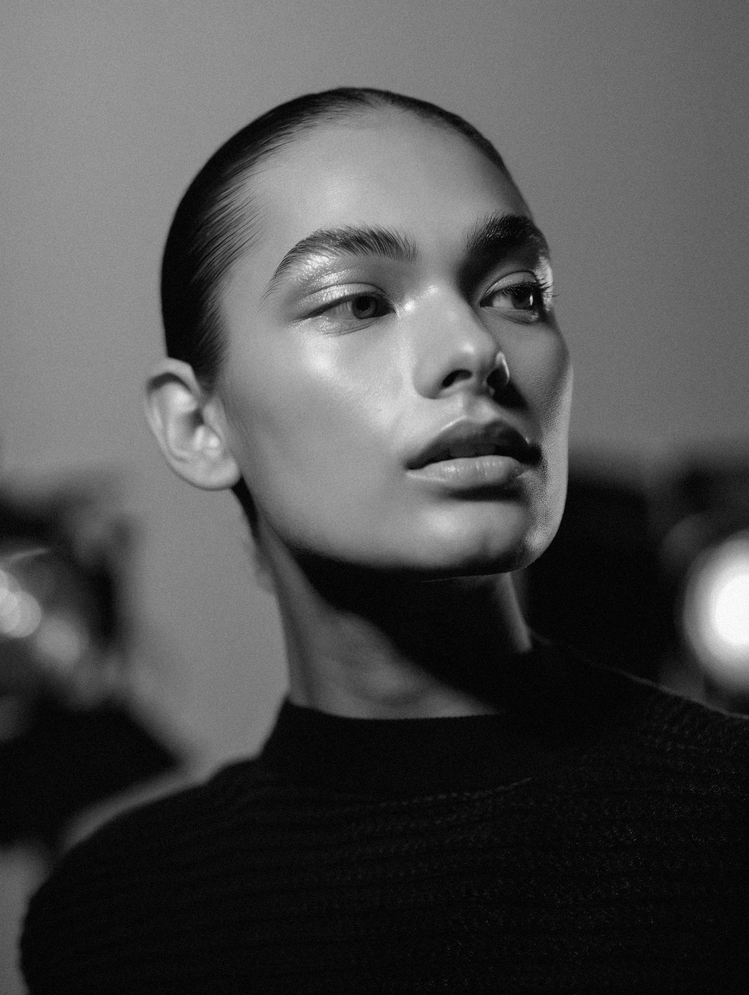 Black-and-white portrait of a person with glowing skin, slicked-back hair, and a contemplative gaze, set against a softly blurred background.