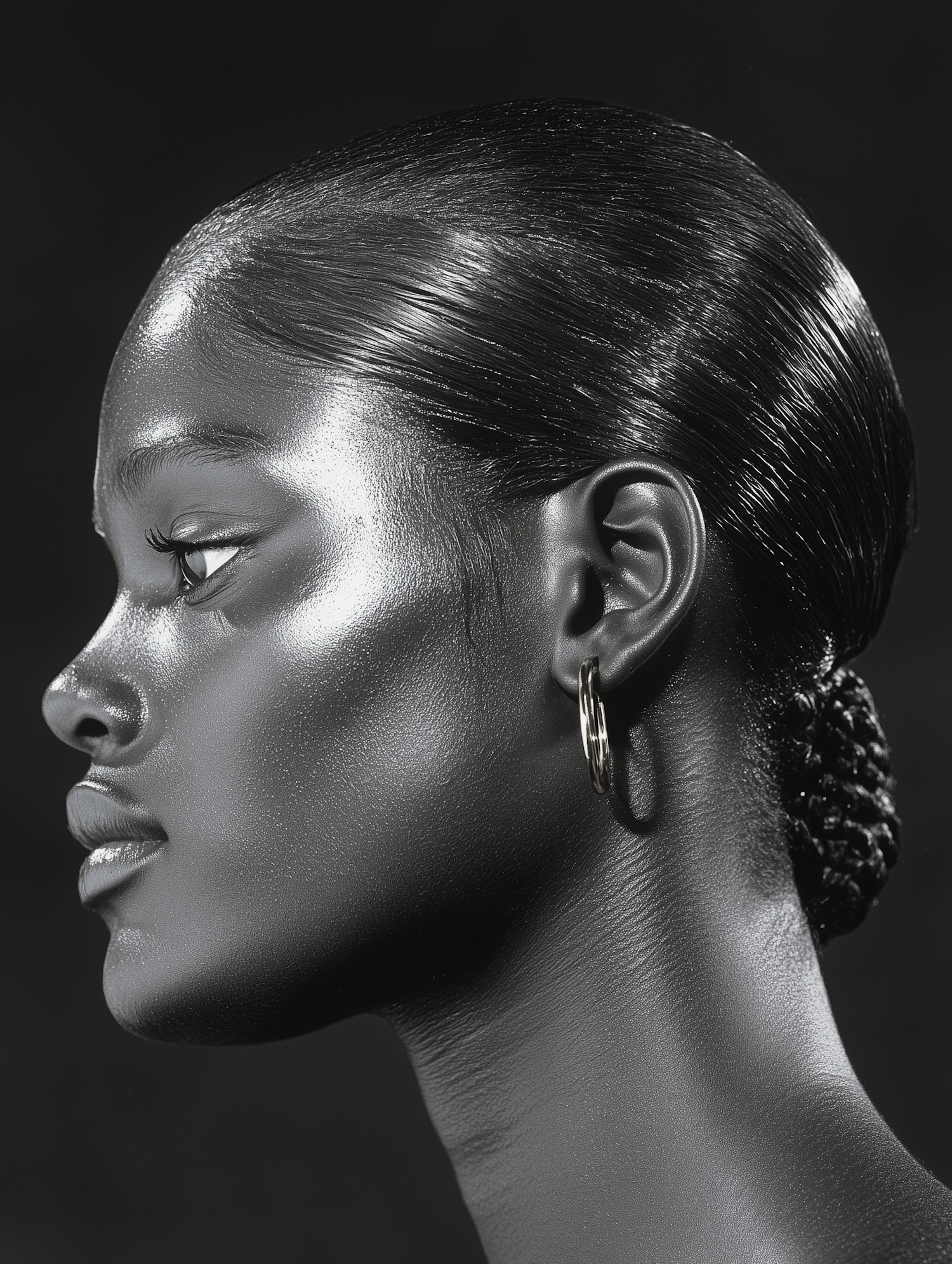 Elegant black-and-white profile portrait of a woman with sleek hair, hoop earring, and luminous skin against a dark background.