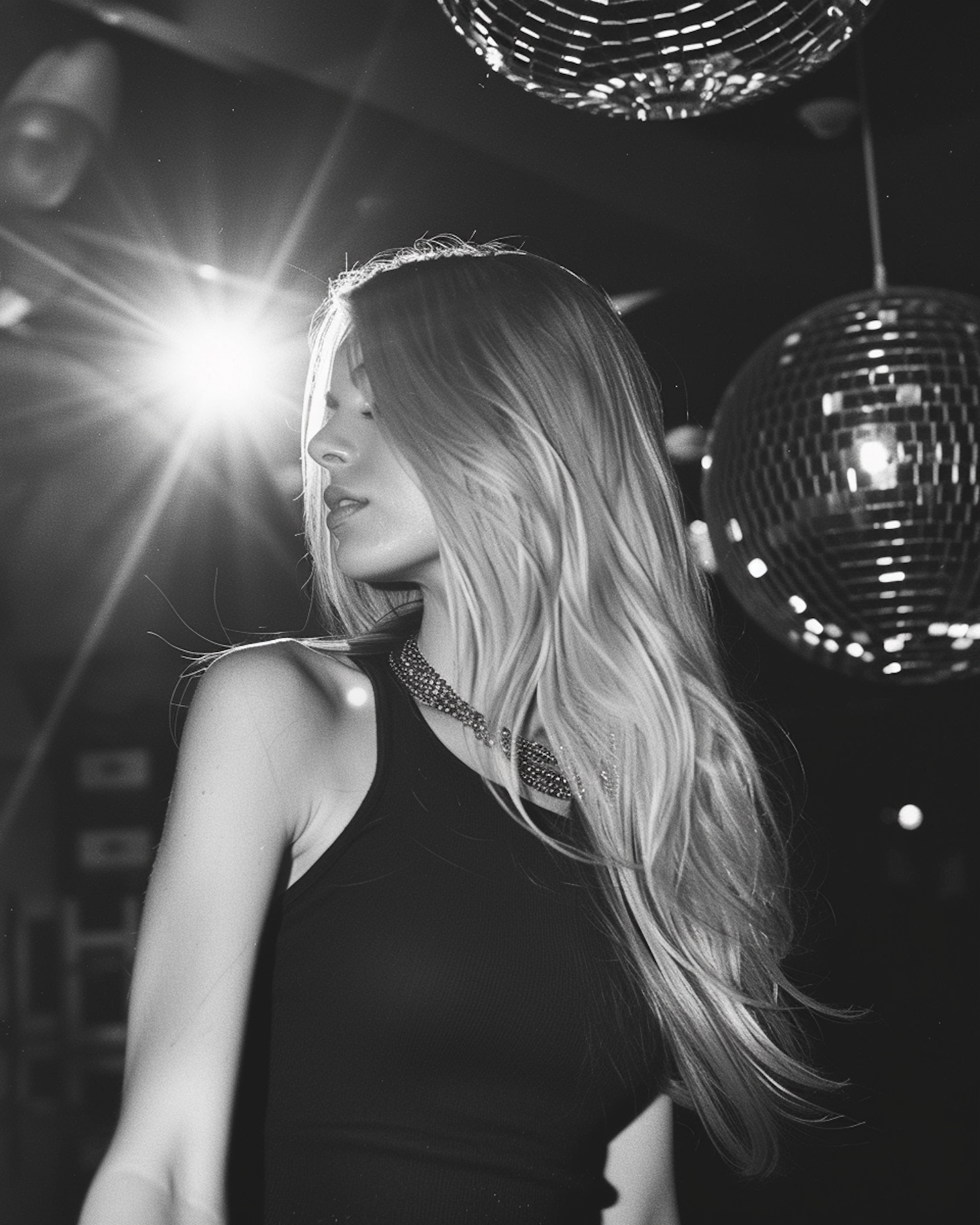 Black-and-white photo of a woman with long blonde hair, disco balls, and dramatic lighting in a party-like setting.