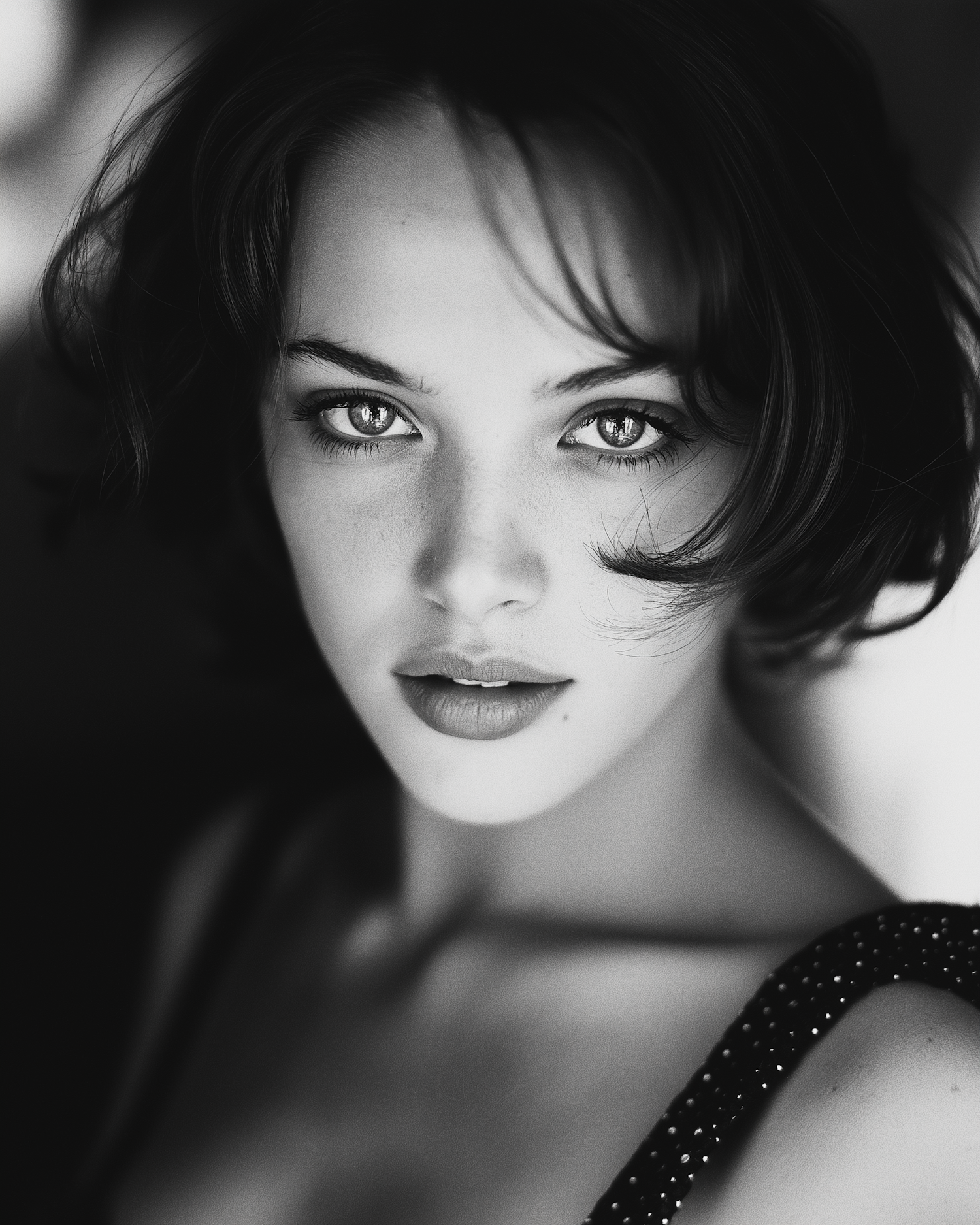 Black-and-white portrait of a young woman with short dark hair, light eyes, and a beauty mark near her lips, exuding elegance and depth.