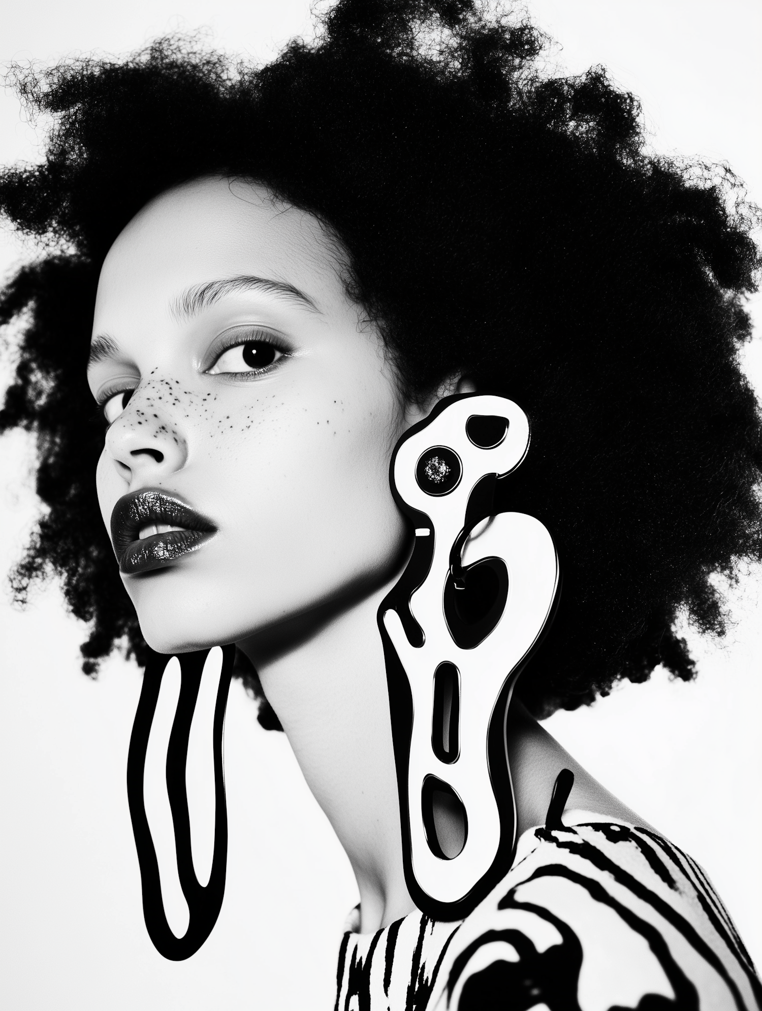 Bold black-and-white portrait of a freckled woman with a voluminous afro, abstract earrings, and a patterned top. Modern and artistic vibe.