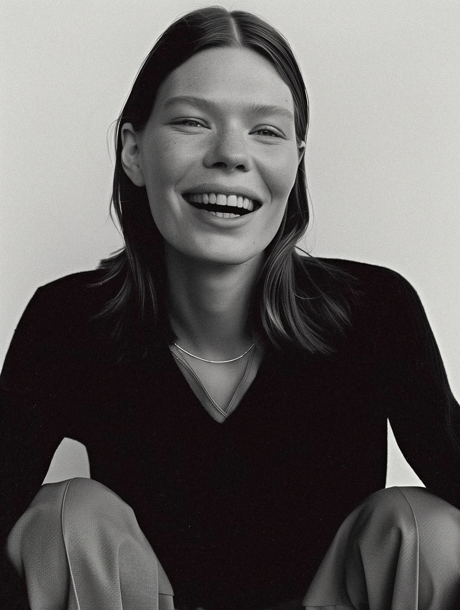 Black-and-white portrait of a smiling woman with dark hair, wearing a simple necklace and a dark top against a plain background.