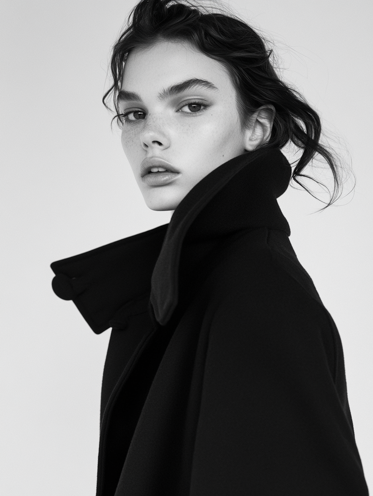 Striking black-and-white portrait of a young woman in a high-collared black coat, with delicate freckles and a neutral expression.