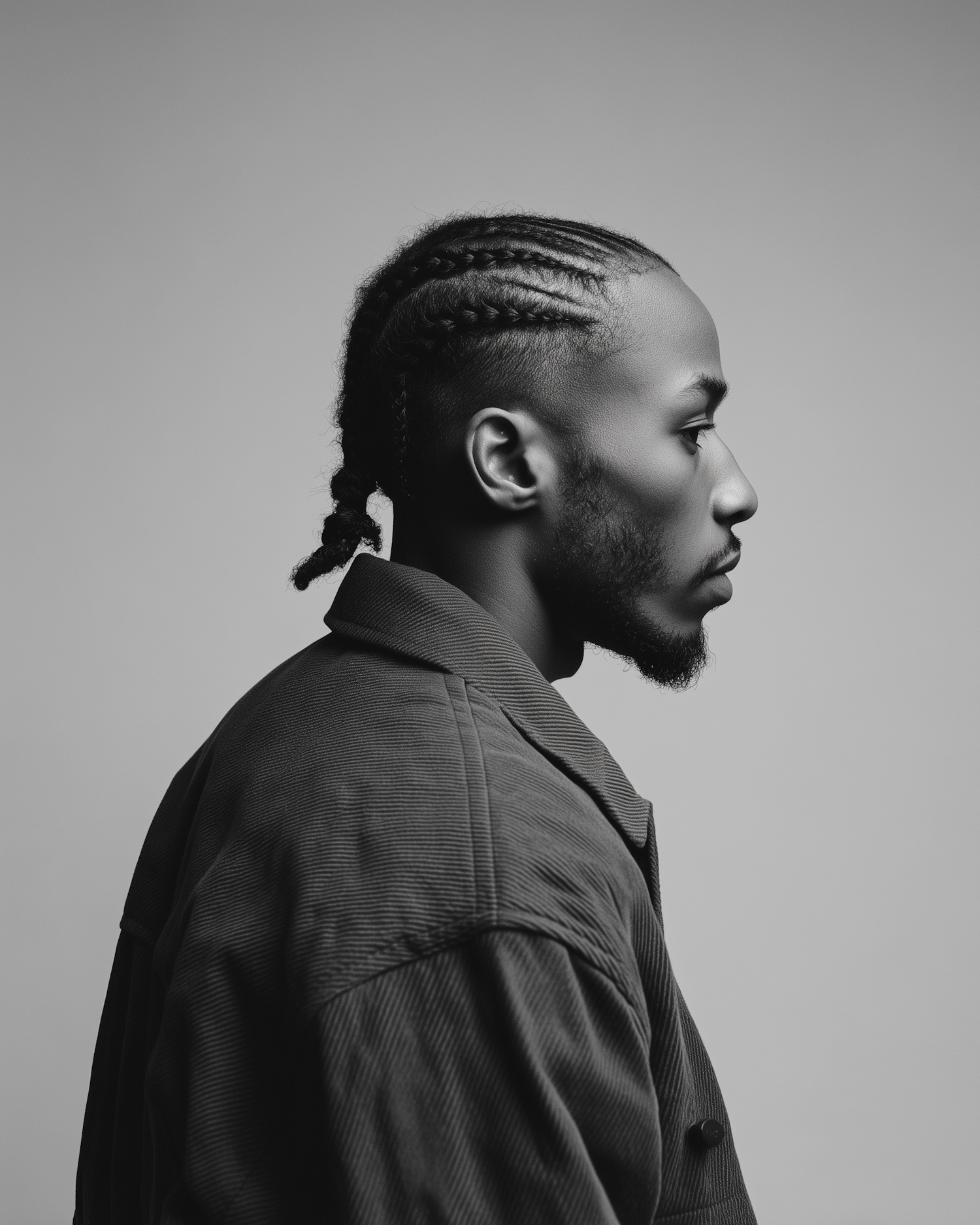 Black and white profile portrait of a man with cornrow braids, a short beard, and a textured jacket against a plain background.