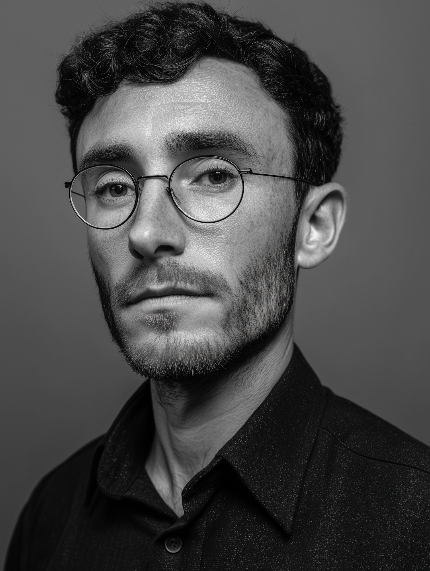 Black-and-white portrait of a man with curly hair, round glasses, and a trimmed beard, wearing a dark shirt against a plain background.