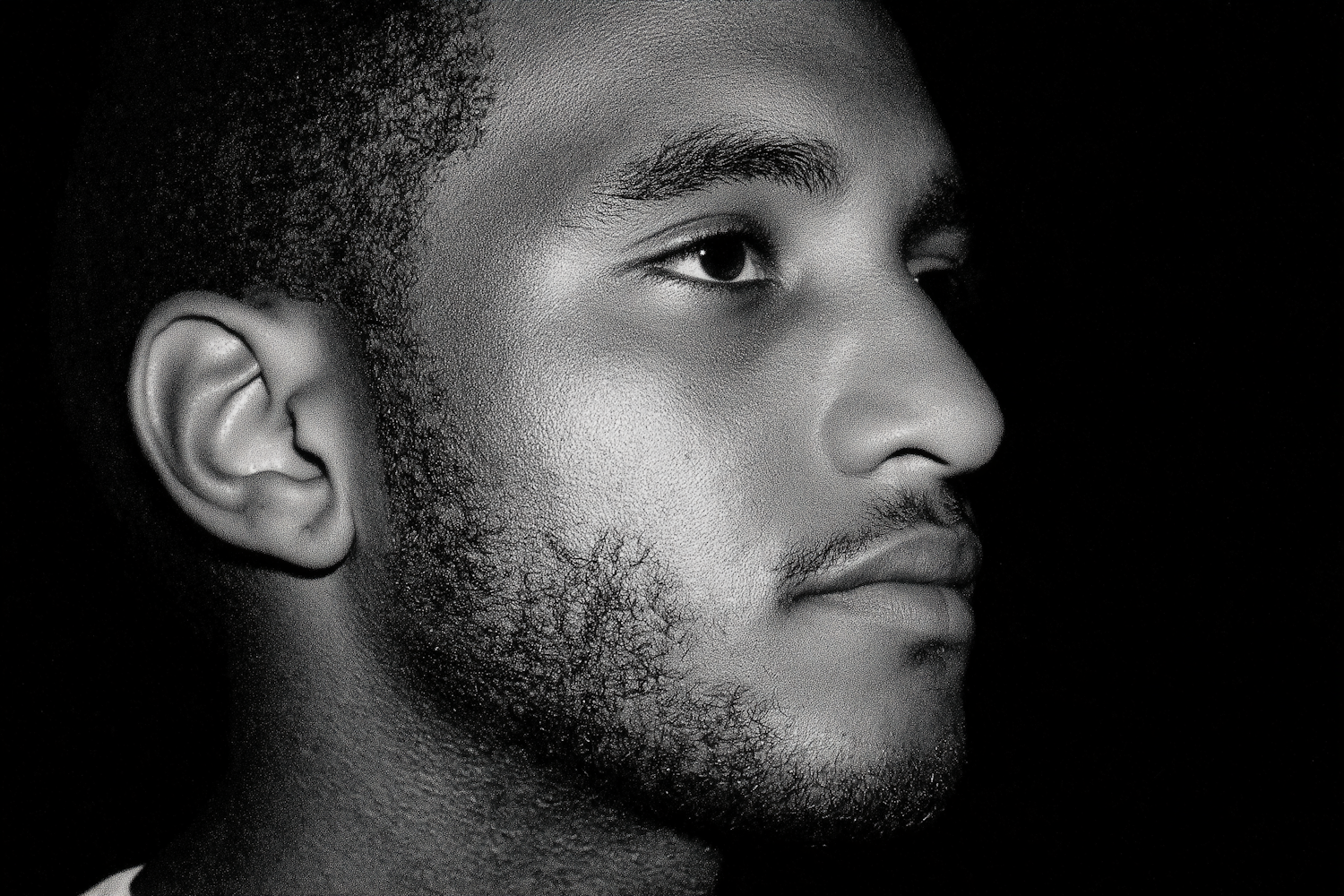 Black and white side-profile portrait of an individual with short hair and facial hair, captured with dramatic contrast.