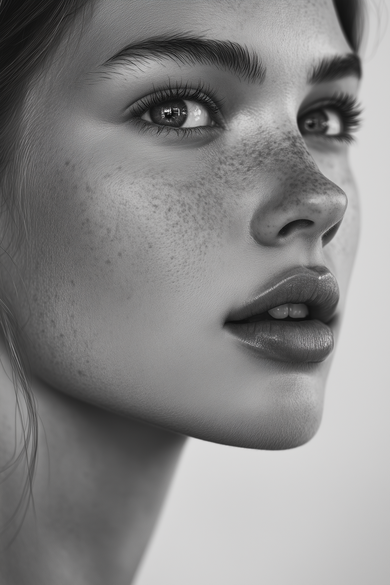Black-and-white close-up of a freckled woman with expressive eyes, full lips, and textured skin, gazing thoughtfully upward.