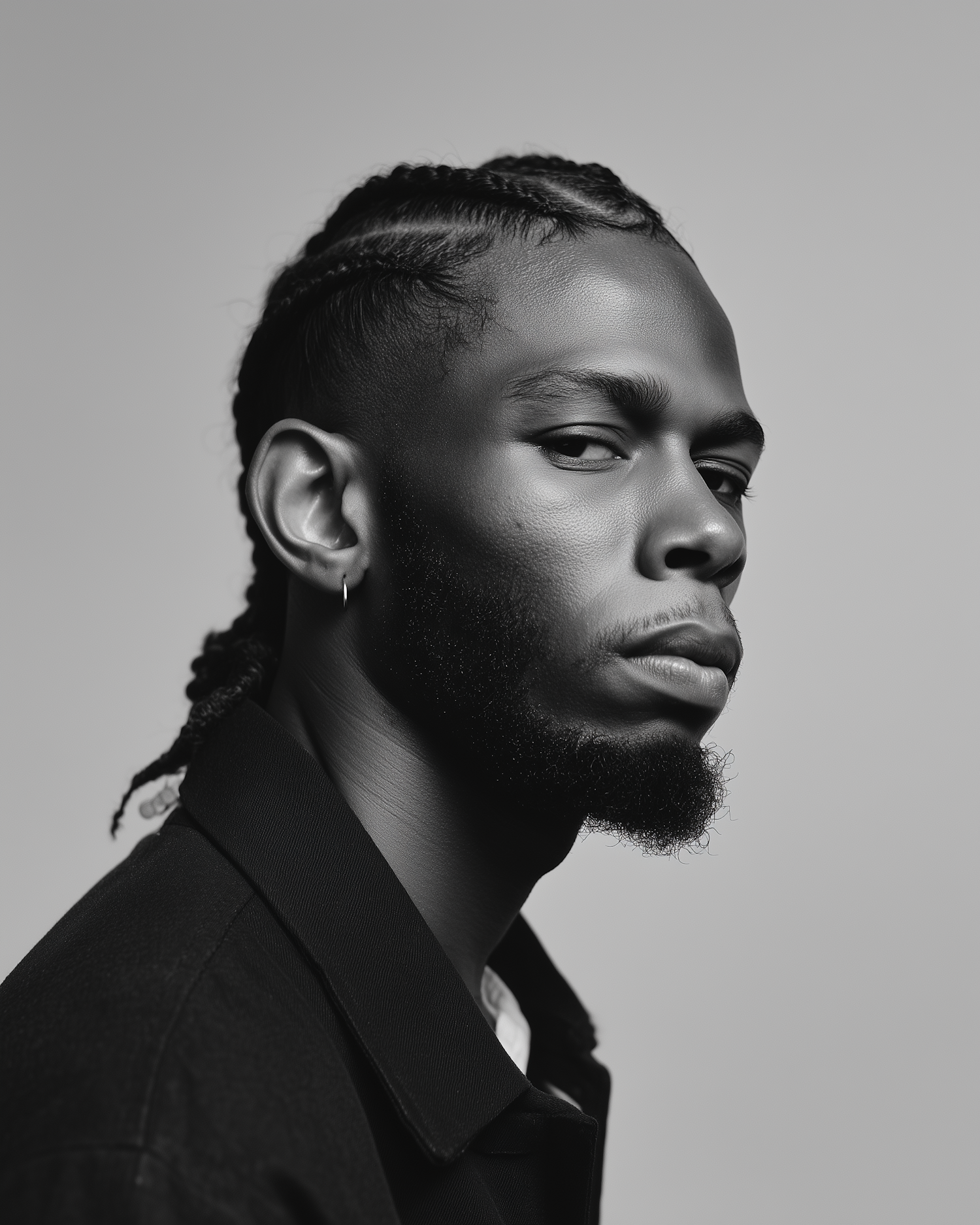 Black and white portrait of a man with cornrow braids, a beard, and a hoop earring, exuding confidence in a minimalist setting.