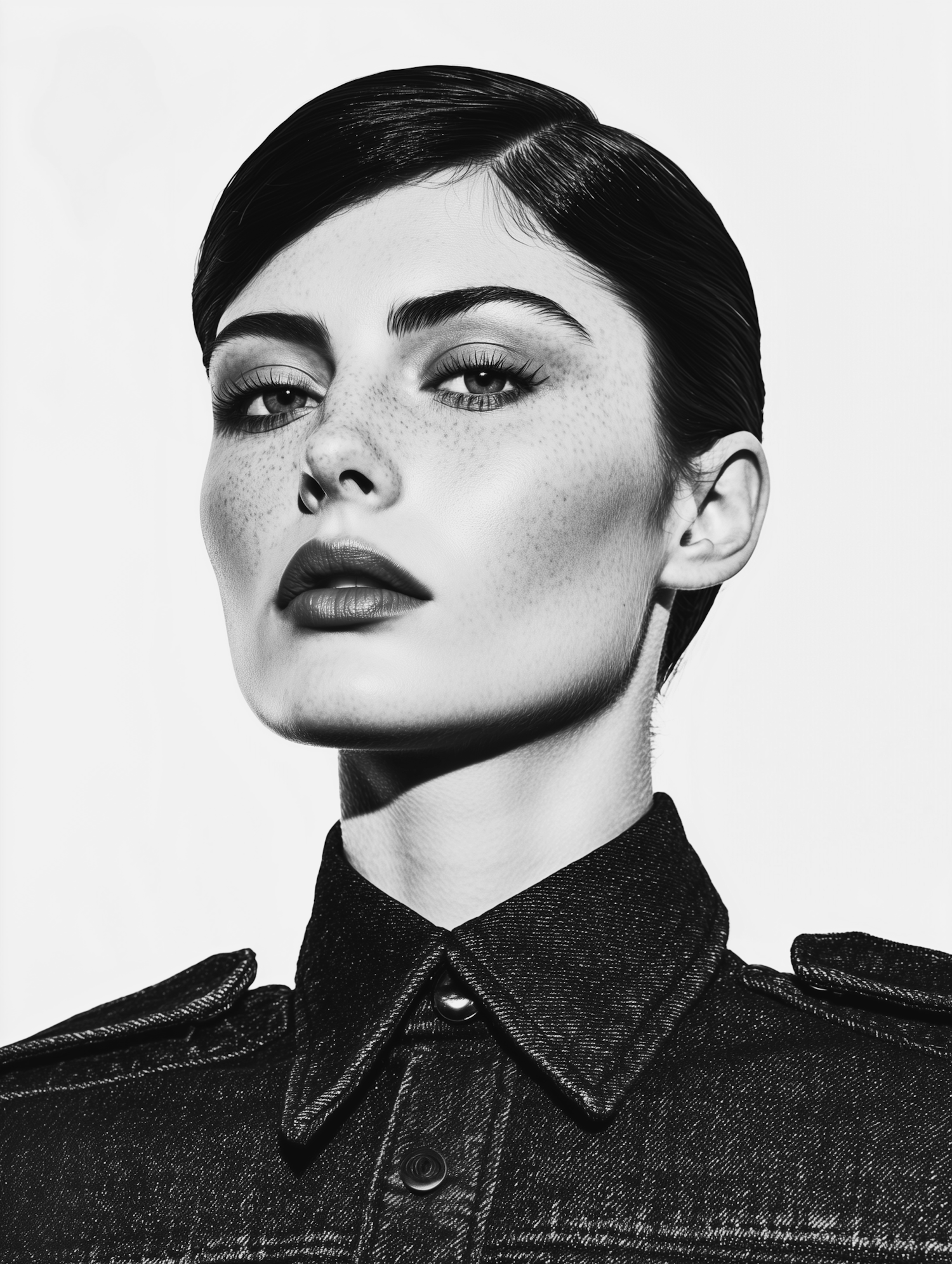 Striking black-and-white portrait of a freckled woman in a structured denim jacket, with sleek hair and bold, confident features.