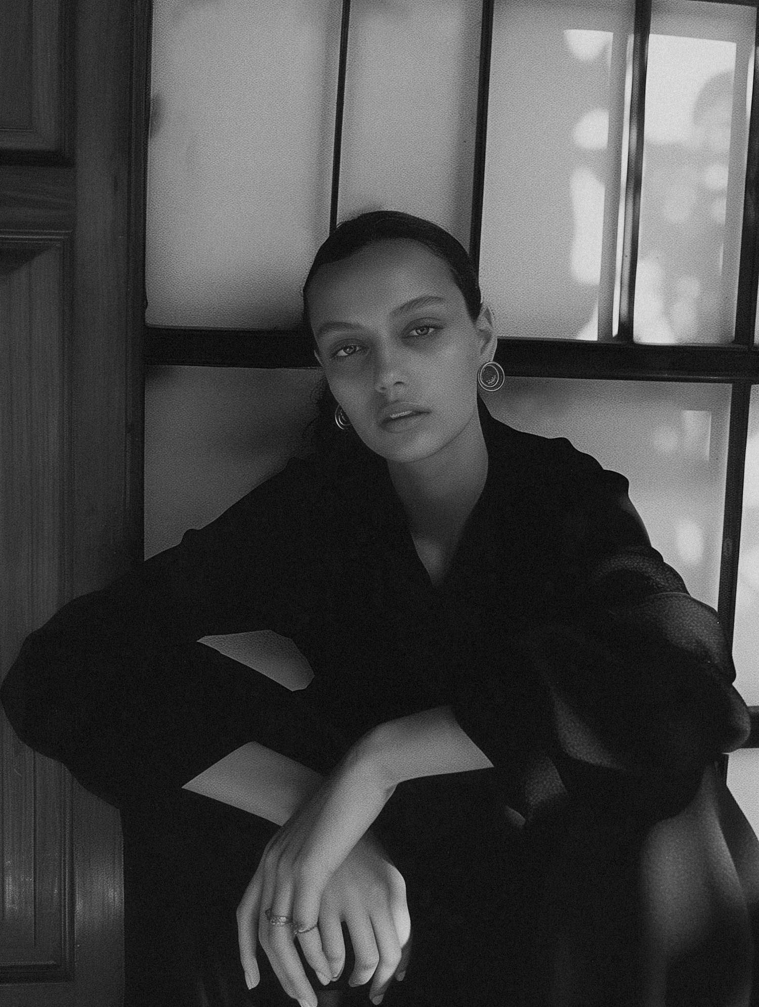 Black-and-white portrait of a woman with hoop earrings, dark outfit, and calm expression, sitting against a door and window with soft shadows.