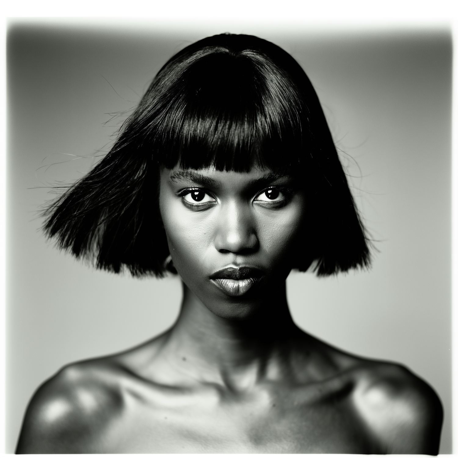 Striking black and white portrait of a woman with a short bob hairstyle and intense gaze, showcasing bold and elegant features.