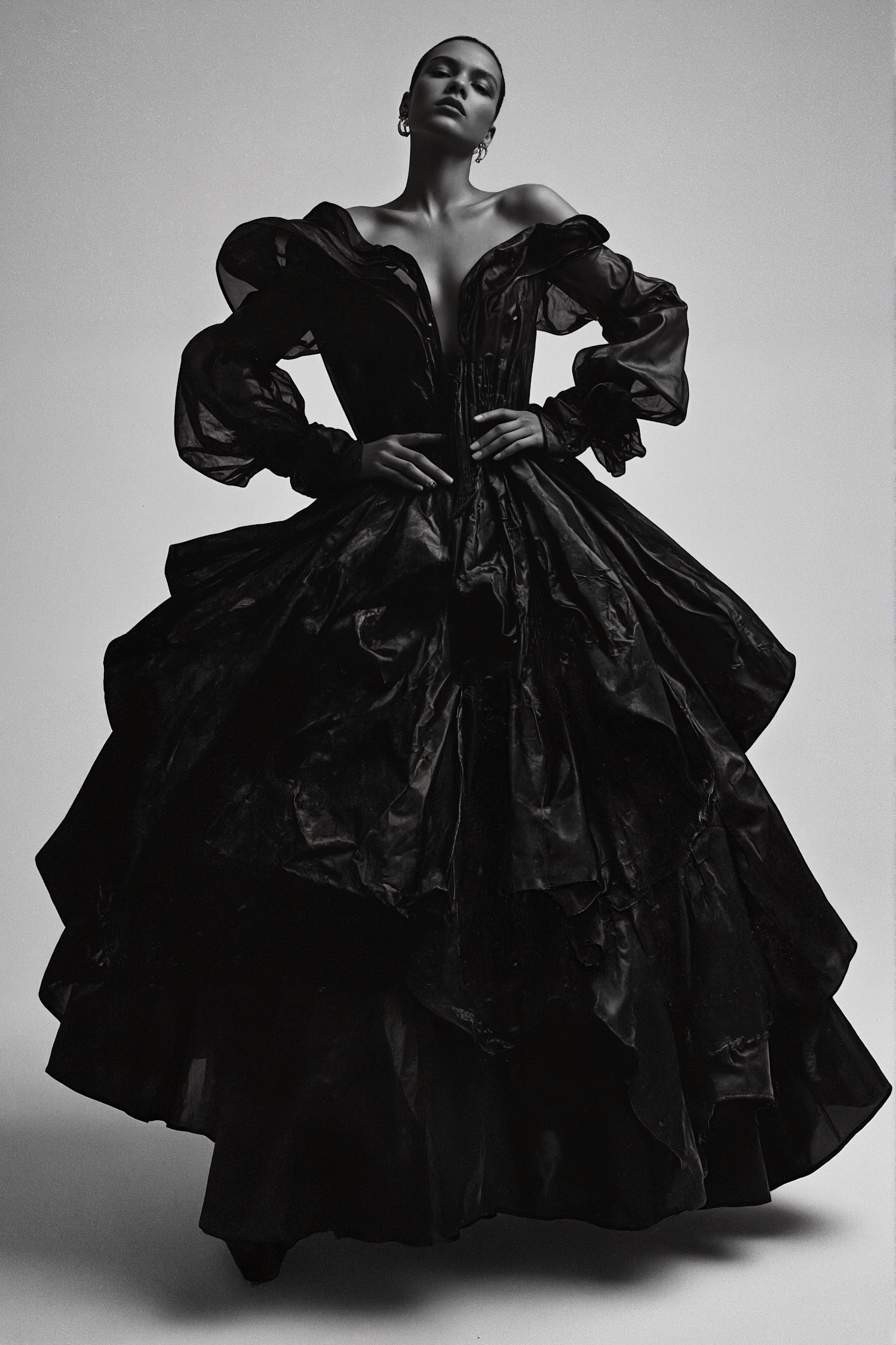 Elegant black and white photo of a woman in a dramatic black gown with puffed sleeves, exuding confidence and style.