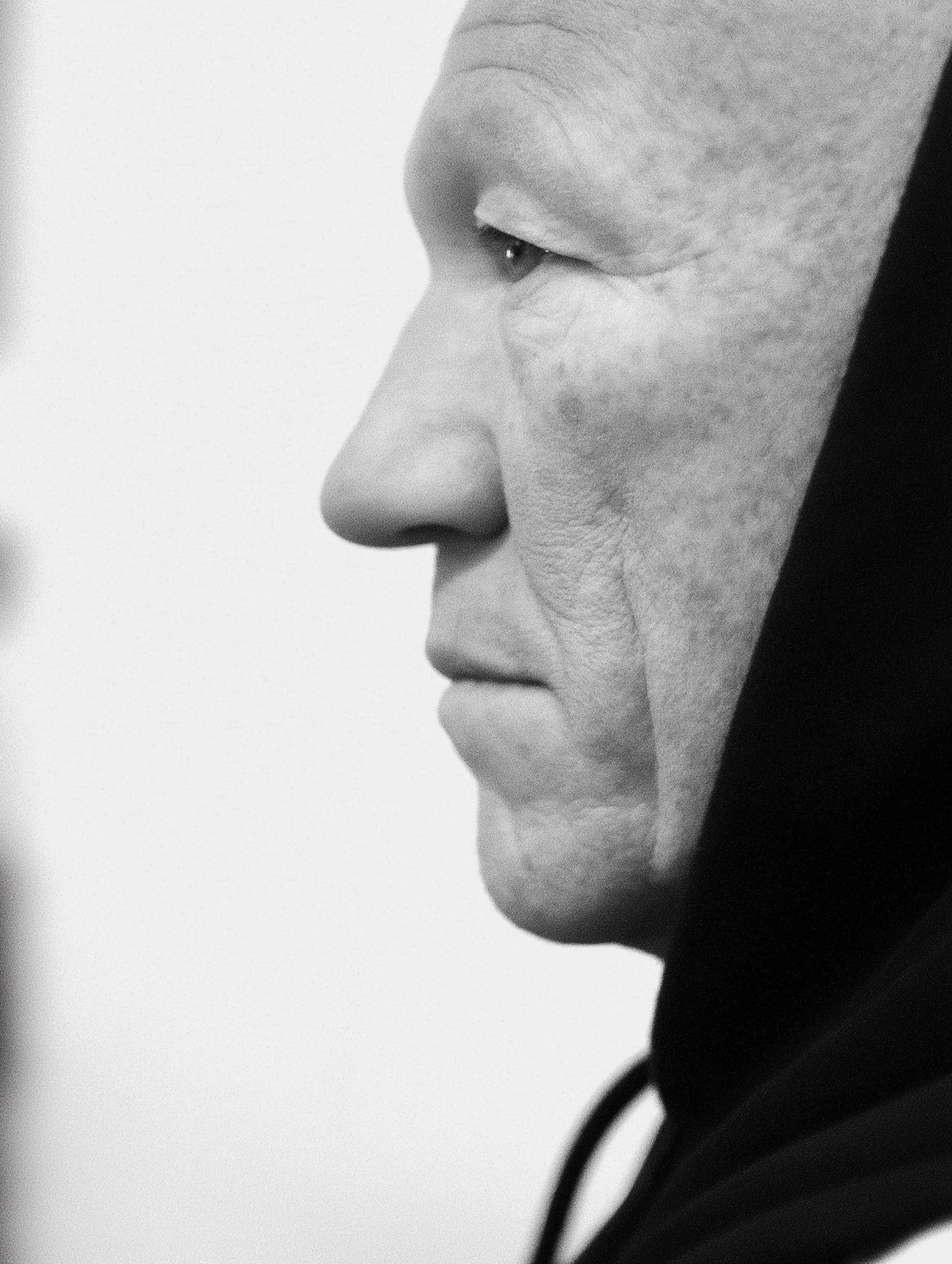 Side profile black-and-white portrait of an elderly person in a hoodie, highlighting facial features and textures against a light background.