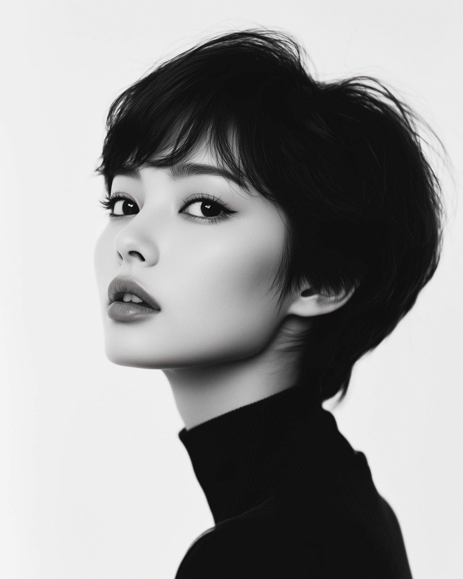 Monochromatic portrait of an Asian woman with short black hair, winged eyeliner, and a black turtleneck against a white background.
