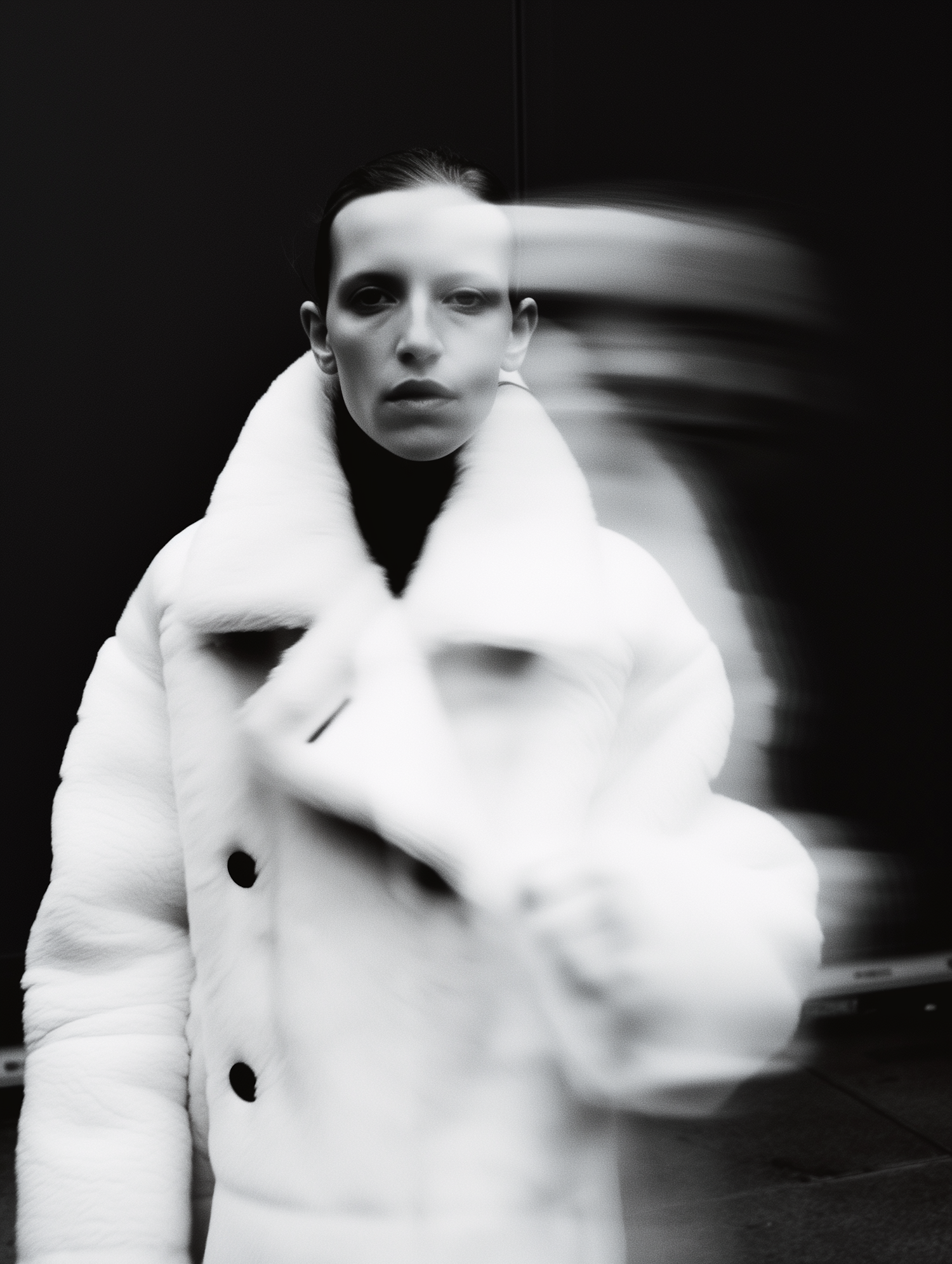 Striking black-and-white portrait of a person in a textured white coat, with blurred motion adding an artistic, surreal touch.