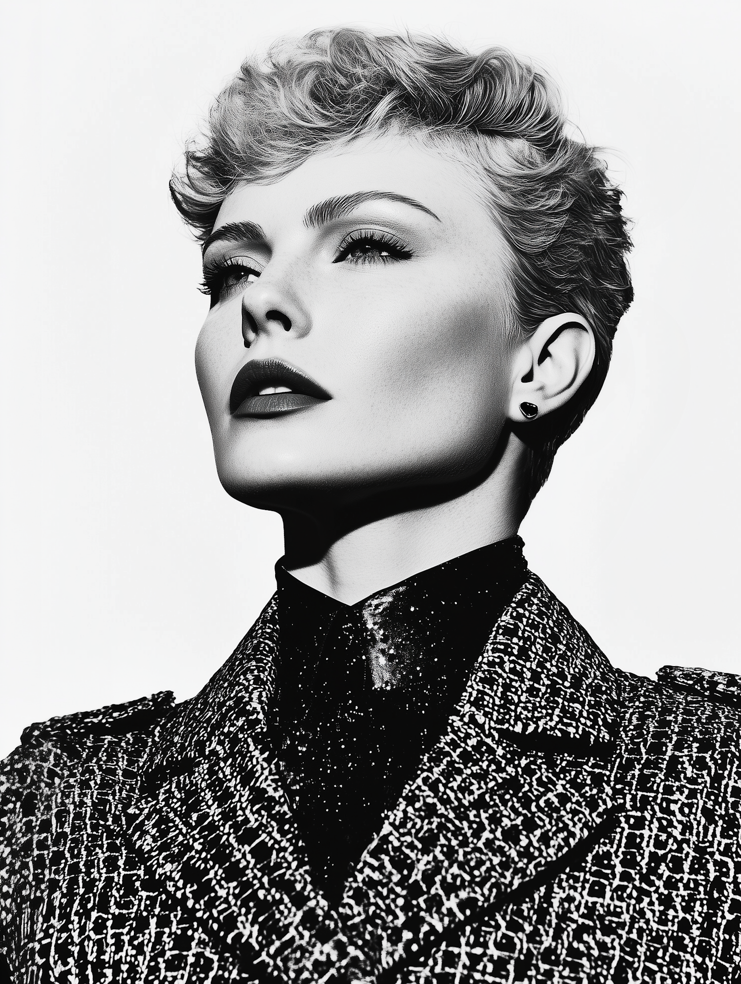 Black-and-white portrait of a woman with short blonde hair, bold makeup, and a textured coat, exuding confidence and sophistication.