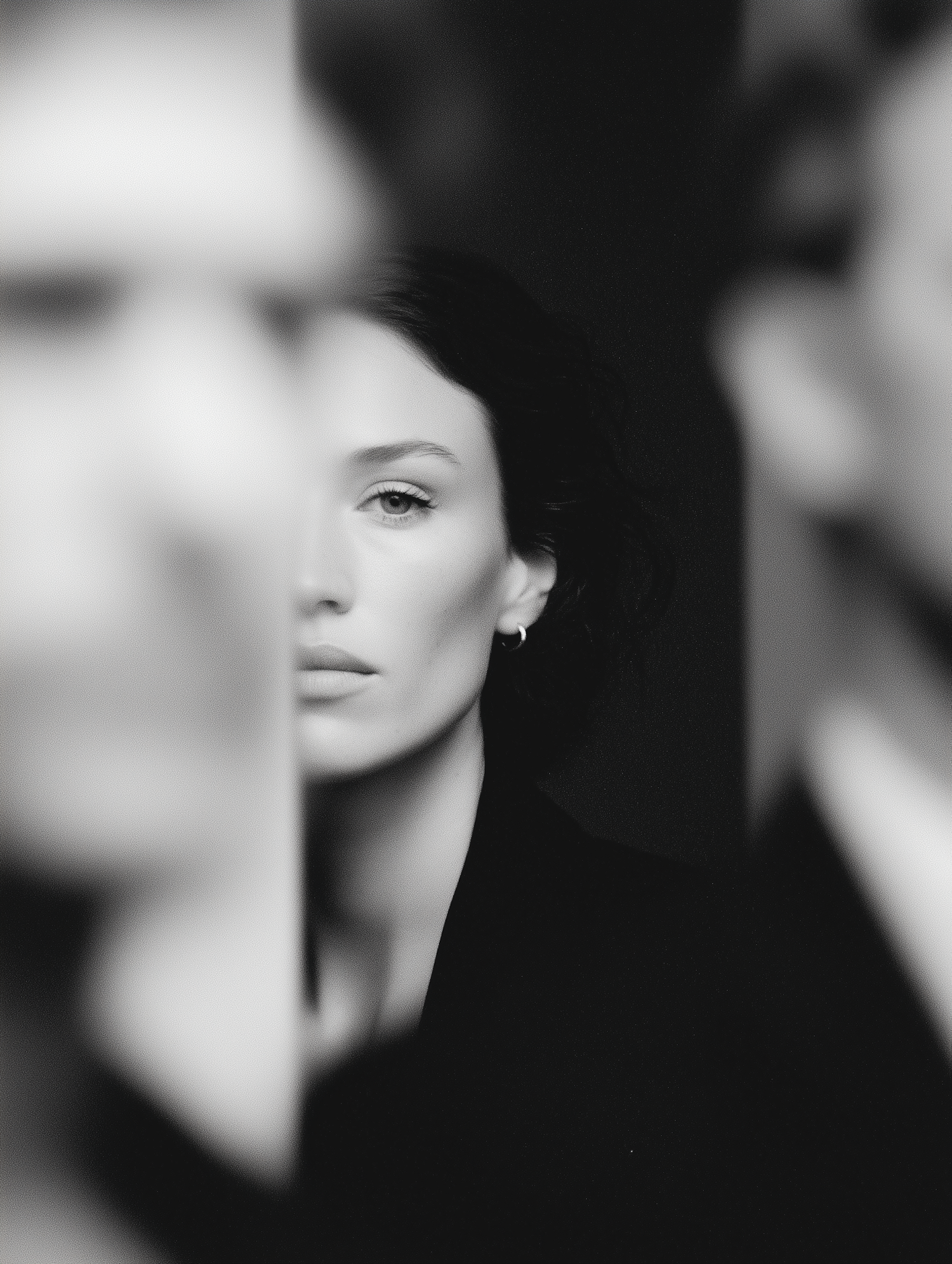 Black-and-white portrait of a woman with dark hair, partially obscured by blurred figures, creating a striking and artistic composition.