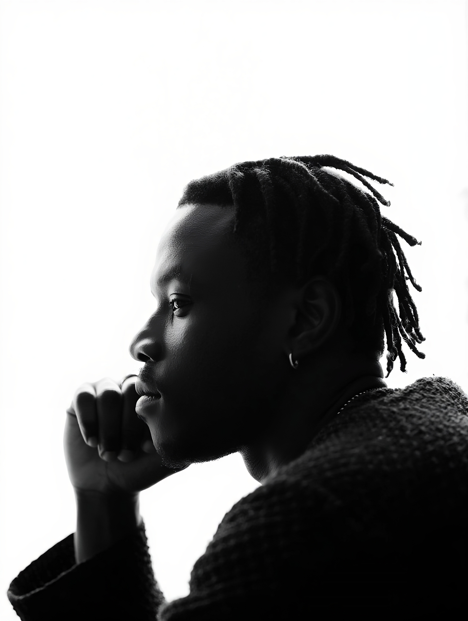 Black-and-white profile portrait of a young man with dreadlocks, wearing a sweater and earring, in a thoughtful pose against a bright background.