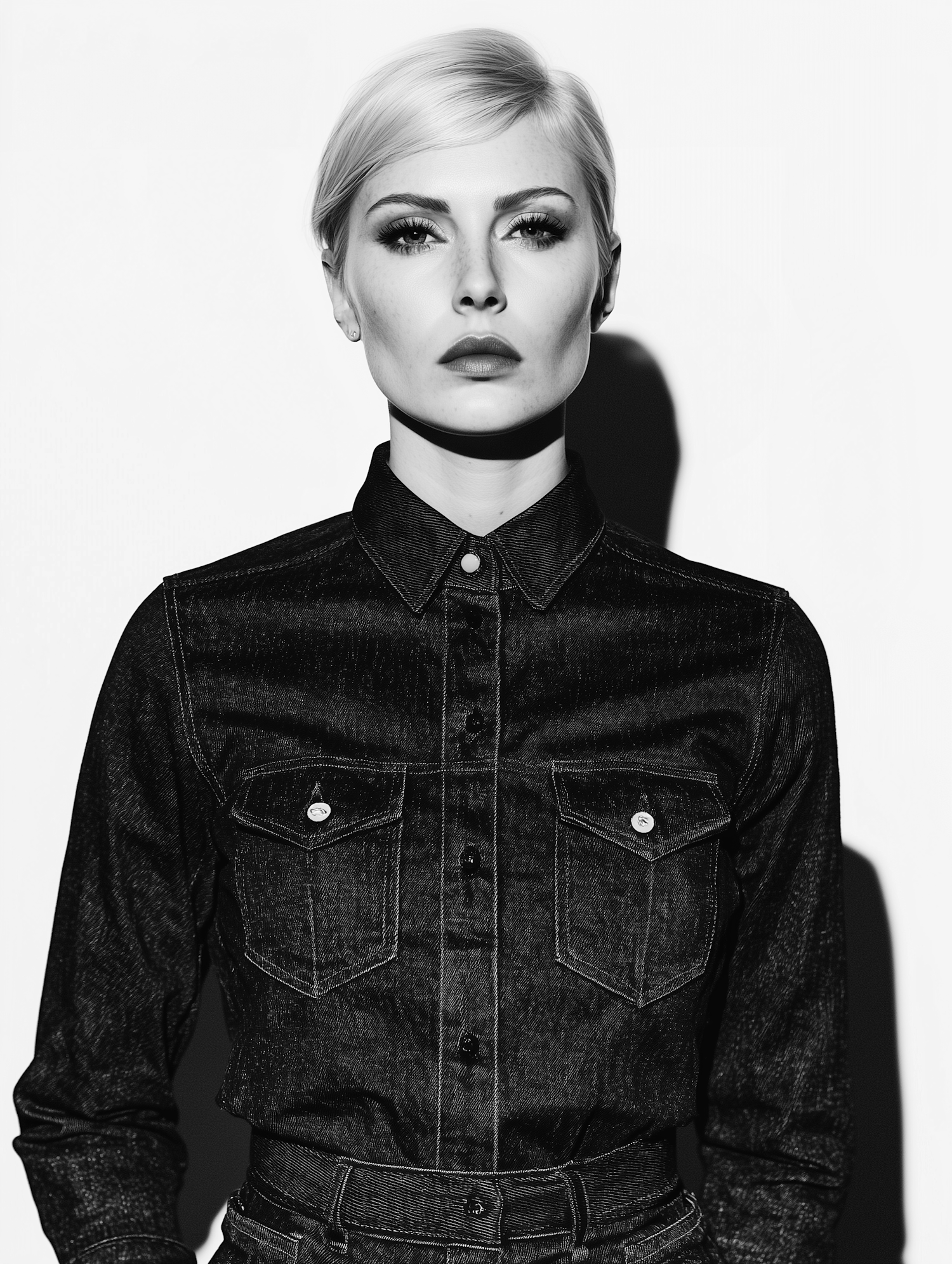 Black-and-white portrait of a woman in a denim shirt, short blonde hair, and bold makeup, with sharp lighting and a plain white background.